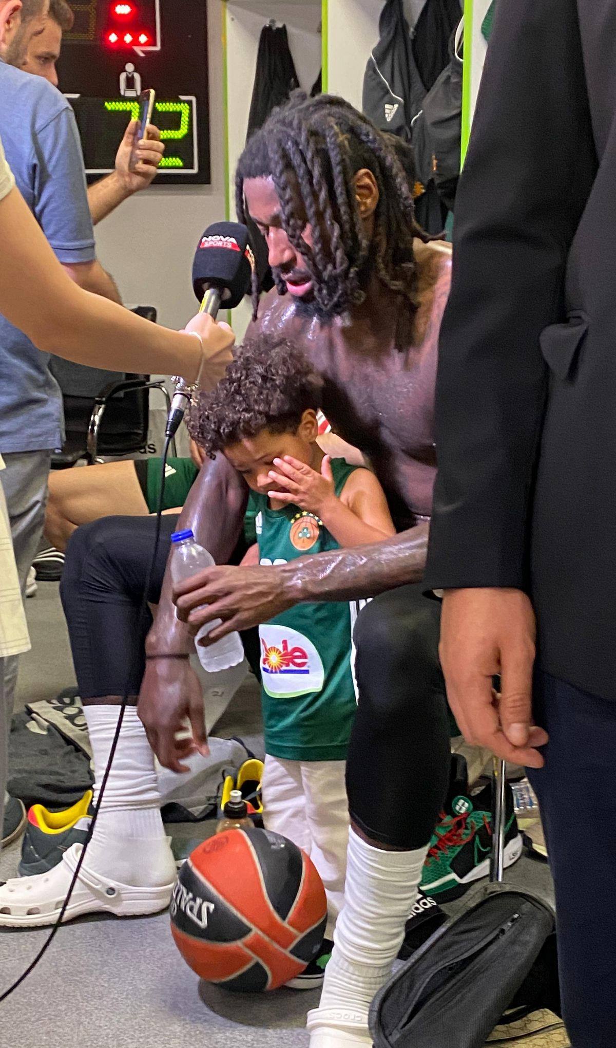 Ο ψηλός του Παναθηναϊκού AKTOR φανερά ενθουσιασμένος για αυτά που βιώνει τις τελευταίες ώρες μετά την κατάκτηση της EuroLeague, φόρεσε κασκόλ των πρασίνων στο κεφάλι του και πανηγύρισε σε φανερά εύθυμη διάθεση.