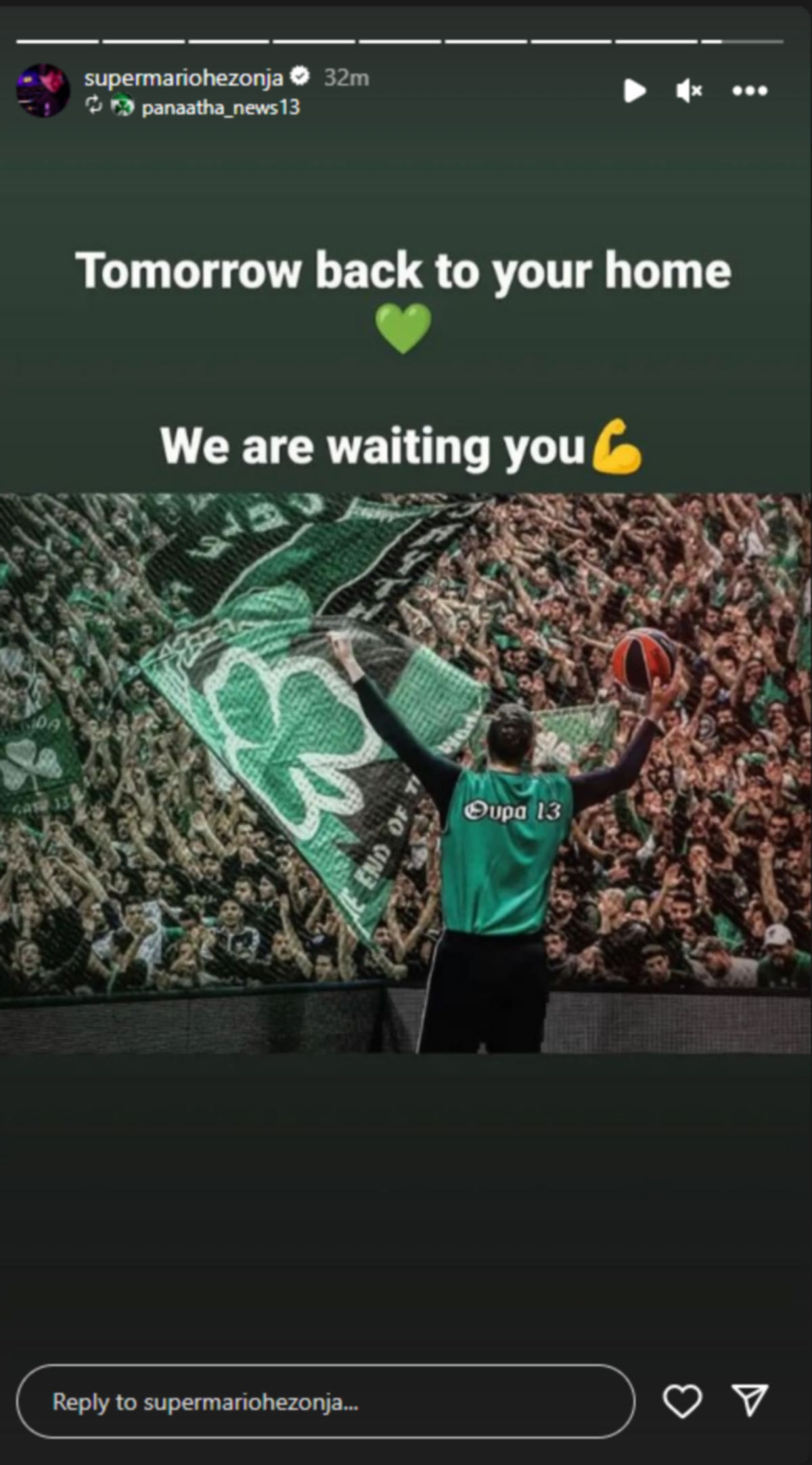 Ο Μάριο Χεζόνια ανυπομονεί να επιστρέψει στο ΟΑΚΑ και να ανταμώσει με τους φίλους του τριφυλλιού. Έχει κατακλείσει με πράσινα στόρι το προφίλ του στο instagram.