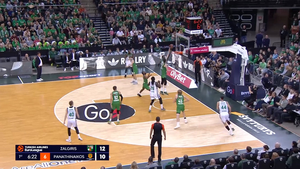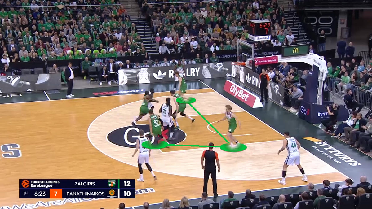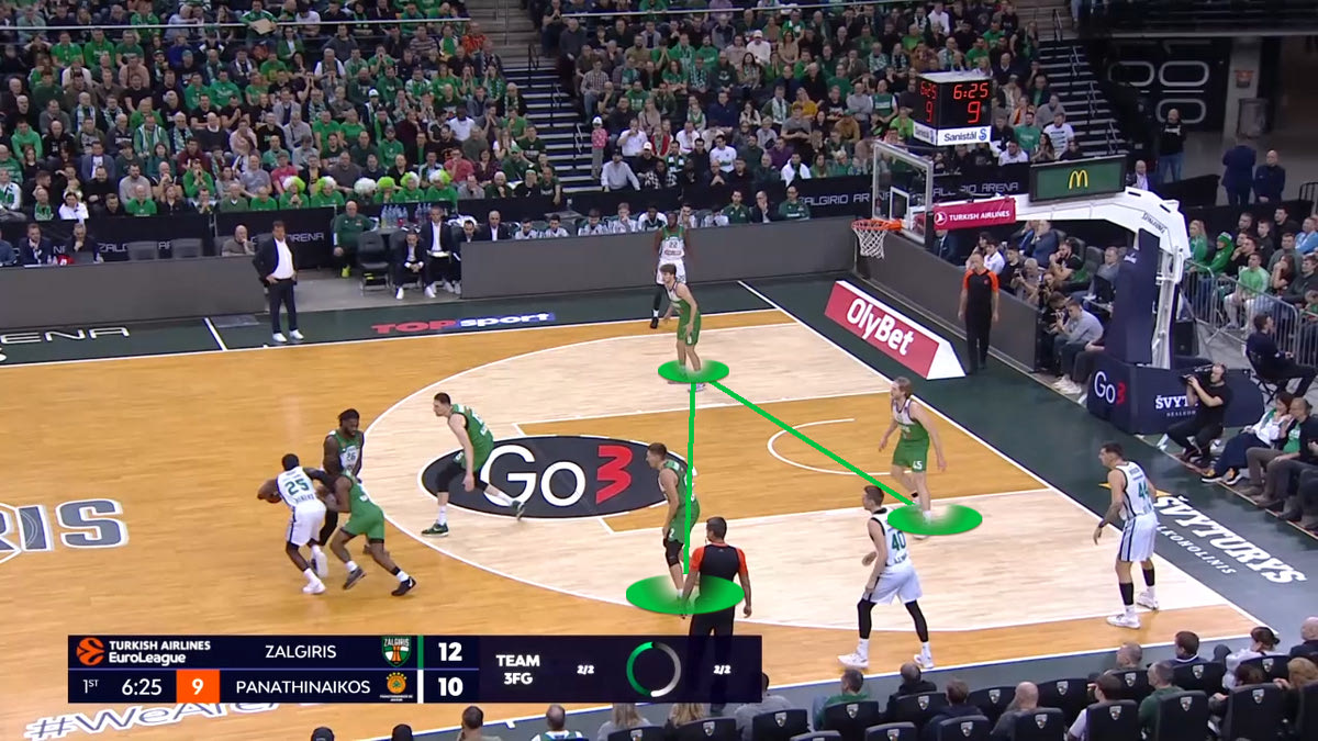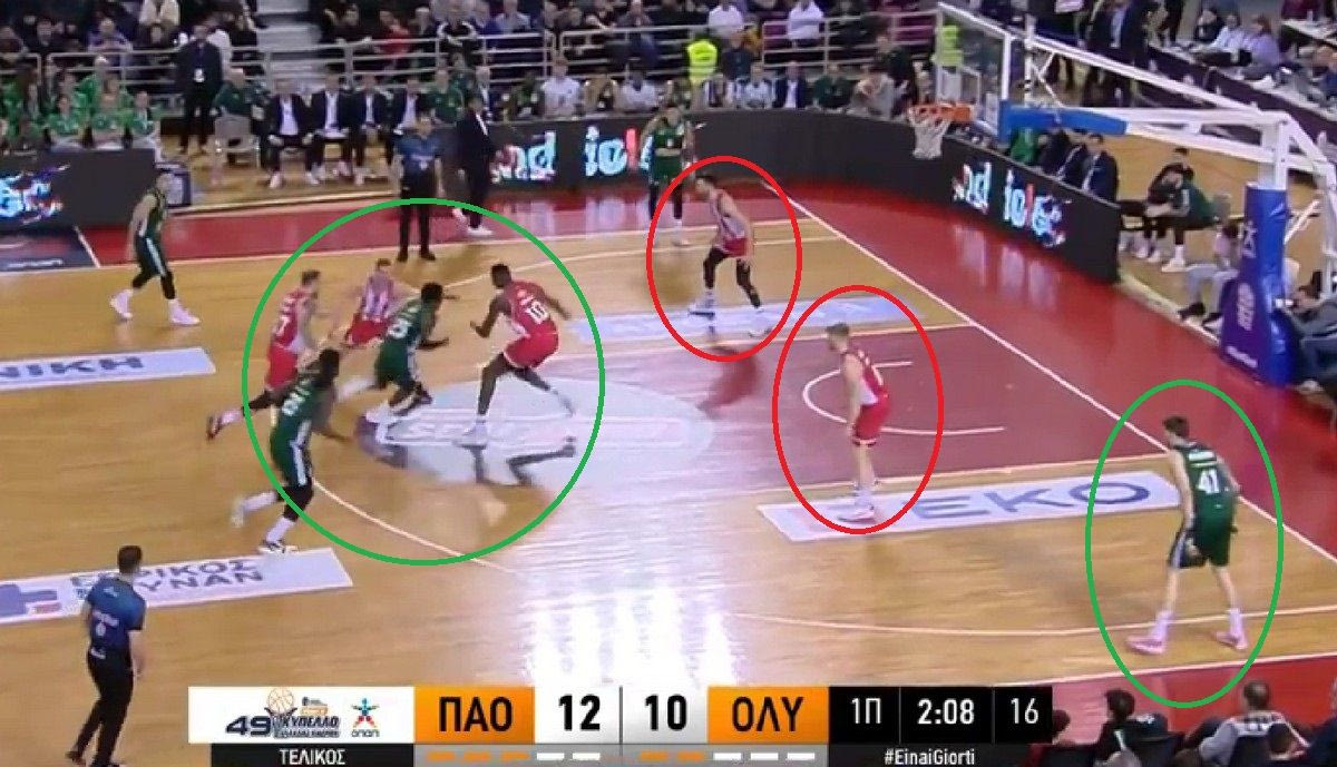 Ο Ναν πάει προς το καλάθι και έχει ήδη 3 παίκτες γύρω του (Φαλ, Λαρεντζάκη και Μπραζντέικις), ενώ οι Πίτερς και Γουόκαπ βρίσκονται σχεδόν μέσα στην ρακέτα. Ο Ερνανγκόμεθ είναι ελεύθερος στην γωνία, αλλά ο Ναν δεν τον βλέπει.