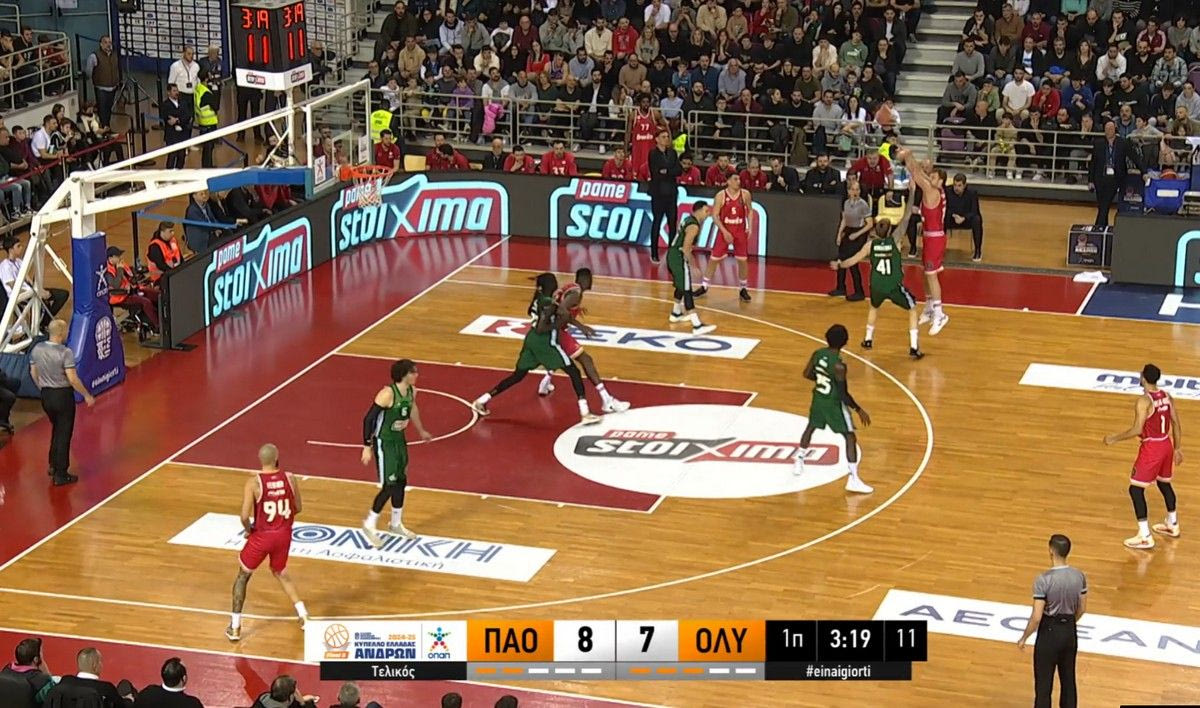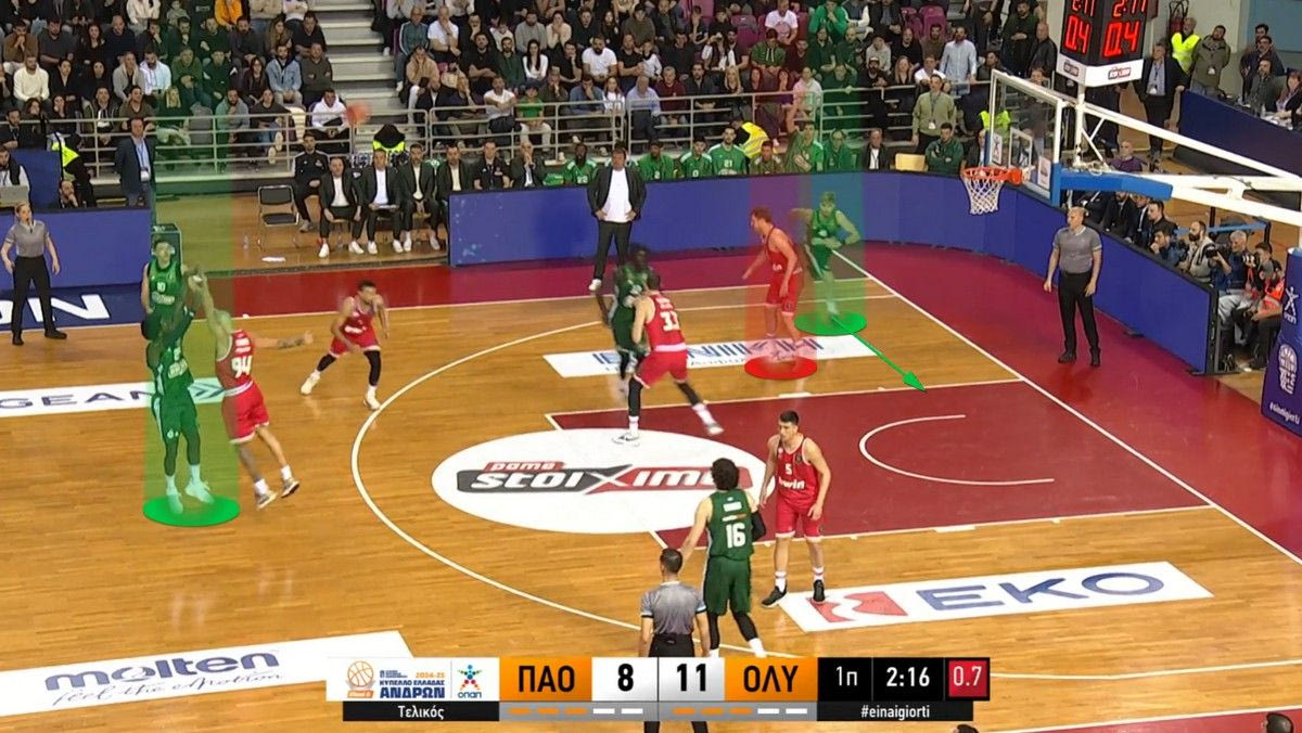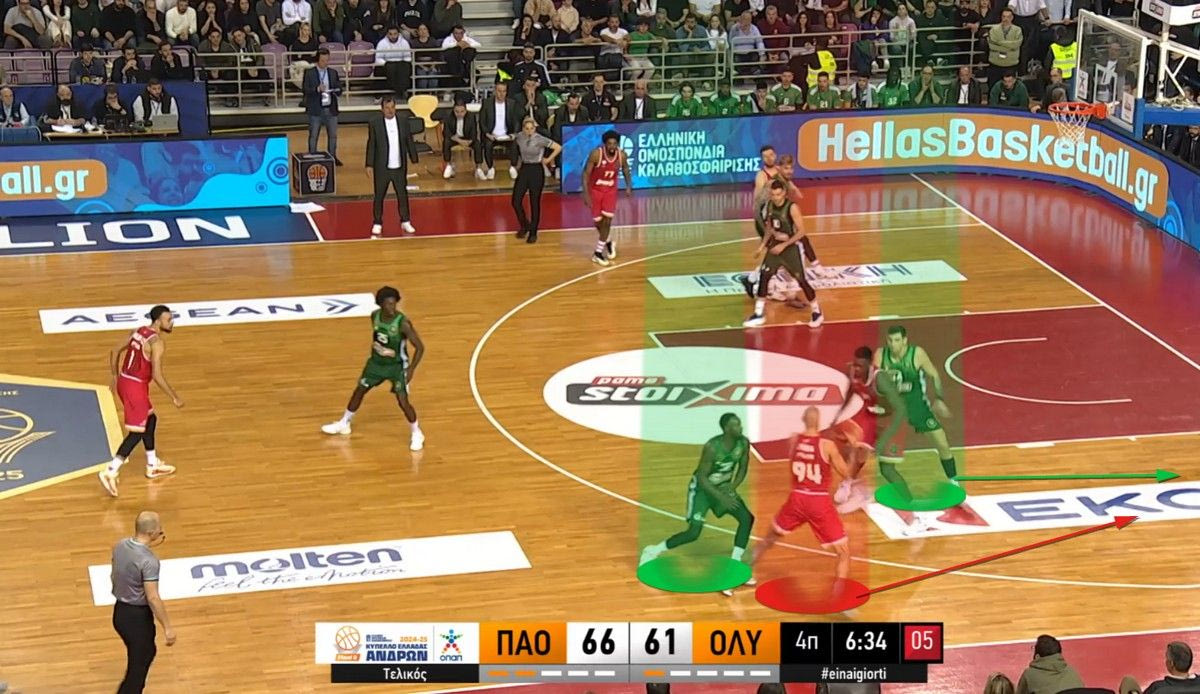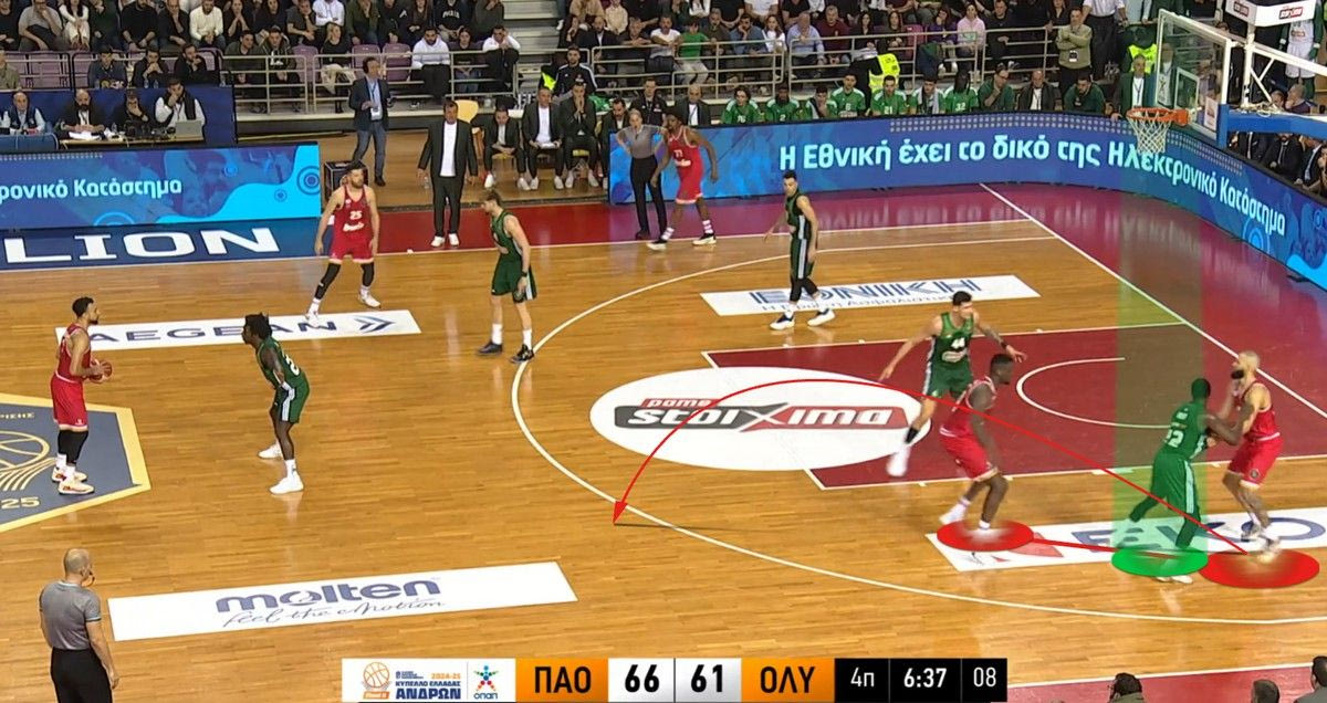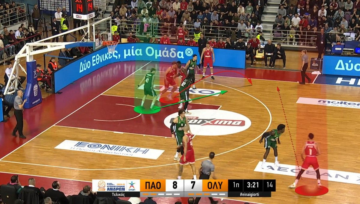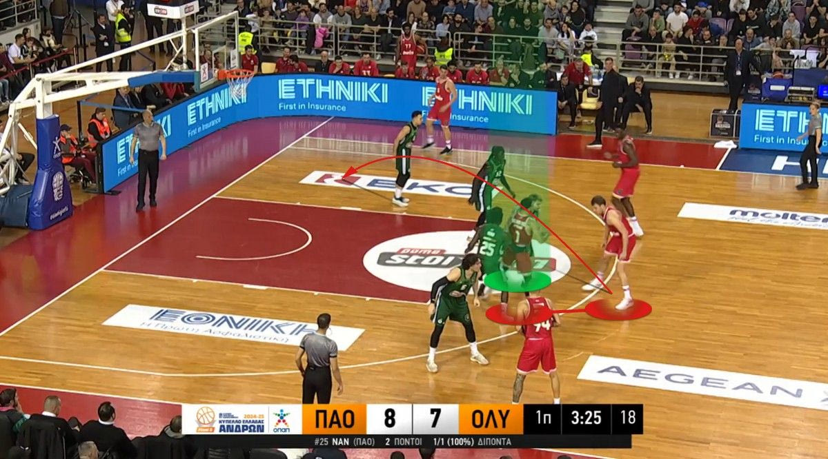 Αυτό το πλάνο εμπεριέχει ρίσκο για τον Παναθηναϊκό AKTOR. Αν ο Χουάντσο δεν πάρει το επιθετικό ριμπάουντ, είναι ευάλωτος στο τρανζίσιον του Βεζένκοβ. Έπιασε όμως. Σύμφωνα με το Hudl Instat, ο σταρ του Ολυμπιακού είχε 0 πόντους στο transition.
