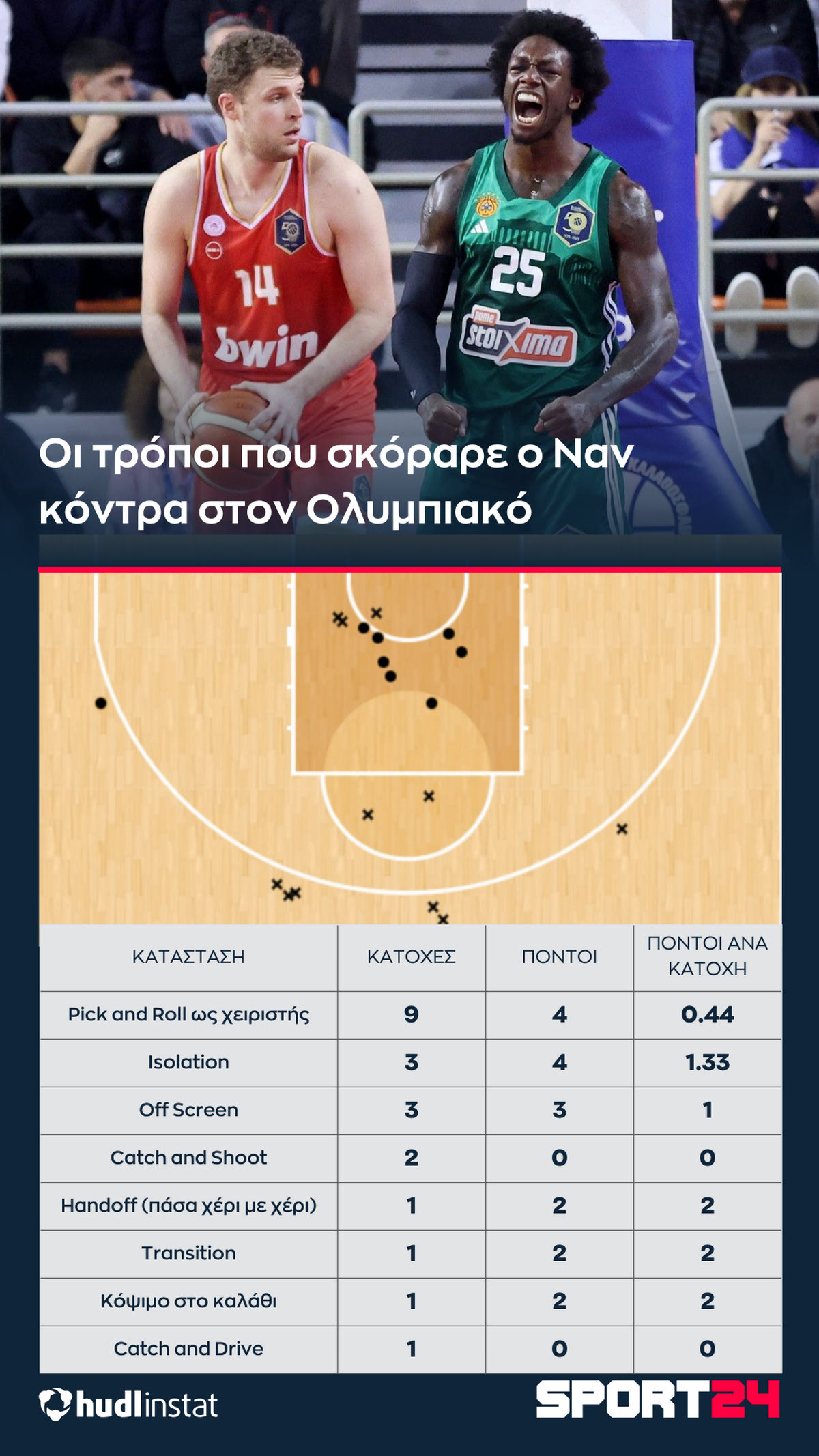 Στην τέταρτη περίοδο, ωστόσο, ήταν η ώρα του Ναν (17 πόντοι και 1 ασίστ, που έδωσε άλλους 3 πόντους). Ο Αμερικανός γκαρντ είχε ένα κακό πρώτο μέρος, με 2 πόντους με 1/8 σουτ, με τον Ολυμπιακό να τον κλείνει σωστά, αφού δεν τον άφηνε να πάει προς το καλάθι και τον υποχρέωνε σε δύσκολα, μαρκαρισμένα σουτ. Στην 4η περίοδο όμως ο Ναν βρήκε τους χώρους που έψαχνε. Κι ακόμα κι αν τα αναλυτικά νούμερά του δεν ήταν καλά, η εικόνα του στην 4η περίοδο, όπου ανέλαβε δράση, τα κάλυψε όλα.