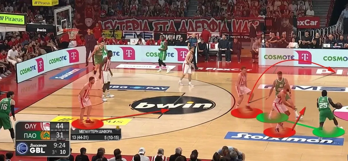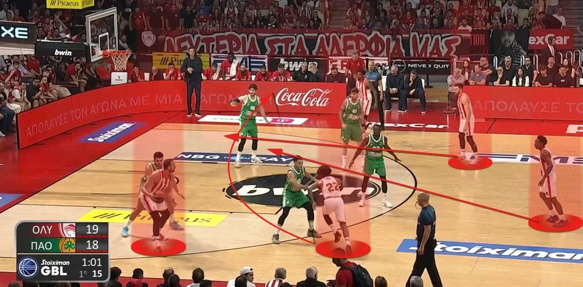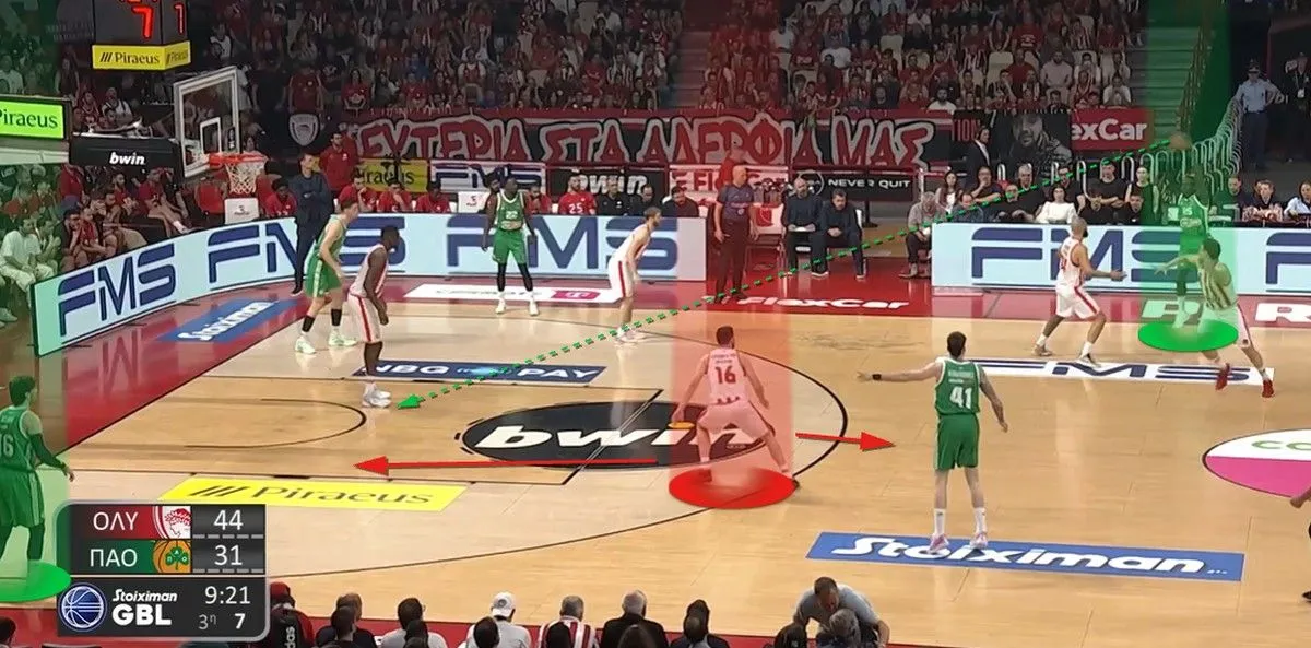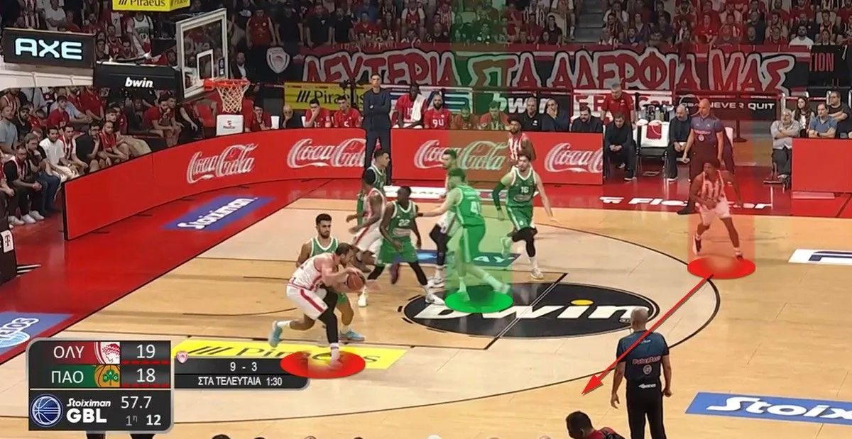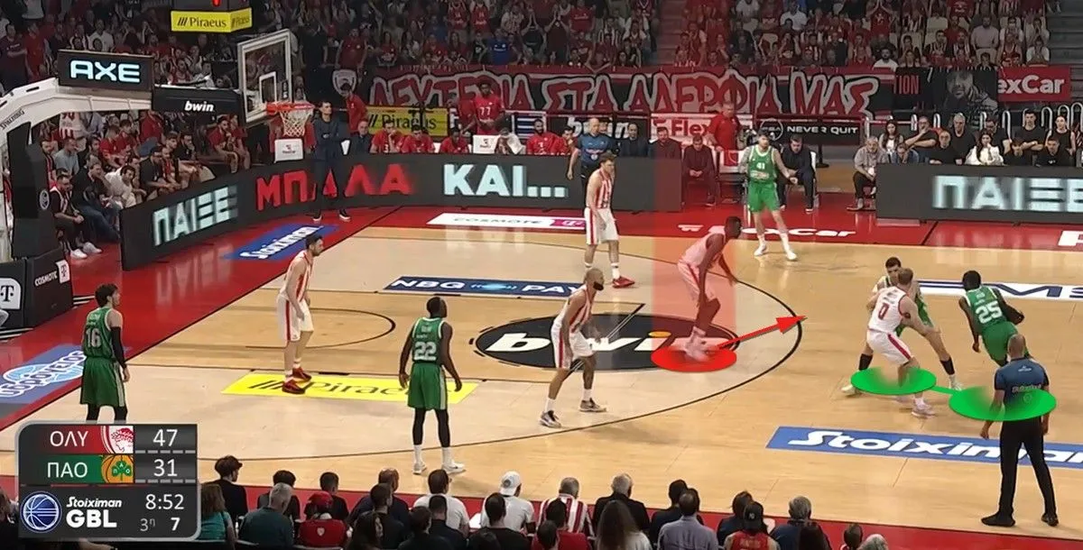 Ο Ολυμπιακός βέβαια δεν έπαιξε μόνο μία άμυνα στον Ναν, δοκίμασε κι άλλα πράγματα. Στα Pick and Roll με το 4αρι έπαιζε Hedge Out (κάτι που κάνει συχνά). Ιδού ένα παράδειγμα: