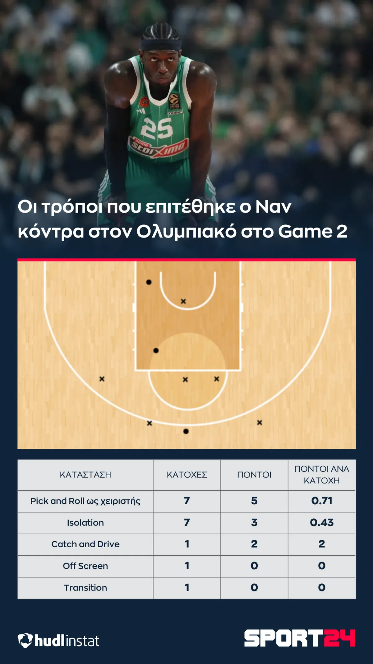 *Με κυκλάκι τα εύστοχα σουτ, με “x” τα άστοχαΟ Ναν πρακτικά κλήθηκε σε 14 διαφορετικές περιπτώσεις να πάρει αποφάσεις με την μπάλα στο ΣΕΦ (από 7 σε Pick and Roll και Isolation), δείχνοντας να έχει προβλήματα από την προσαρμοσμένη άμυνα του Ολυμπιακού, ειδικά στο 2ο μέρος, όταν οι “ερυθρόλευκοι” αρχικά έσπαγαν τα σκριν στο Pick and Roll και ακολούθως έκαναν αλλαγή στο σκριν. Δεν βρήκε χώρους, ενίοτε πίεζε καταστάσεις. Ιδού ένα παράδειγμα: