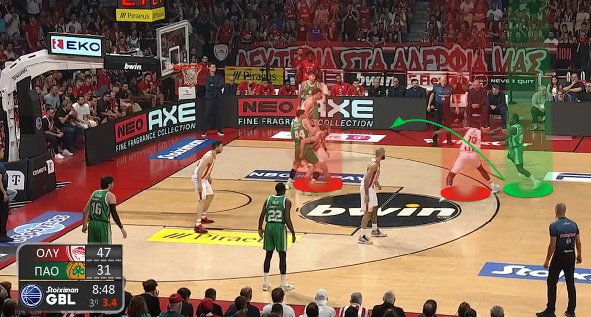 Φάσεις όπως αυτή αντικατοπτρίζουν περισσότερο τον Ολυμπιακό. Φάσεις όπου υπάρχει κίνηση, η αντίπαλη άμυνα απασχολείται. Σαφώς και αυτή η φάση είναι και προϊόν της απειλής που ήταν ο Ντόρσεϊ στο Game 2 (περισσότερα για αυτό σε λίγο) και τα σουτ που έβαλε ο ομογενής γκαρντ, αλλά και ο Τόμας Γουόκαπ. Η άμυνα των “ερυθρολεύκων” ήταν επίσης σημαντική. Όσο ο Ολυμπιακός όμως βγάζει φάσεις όπως αυτή, έχει άλλο μομέντουμ.