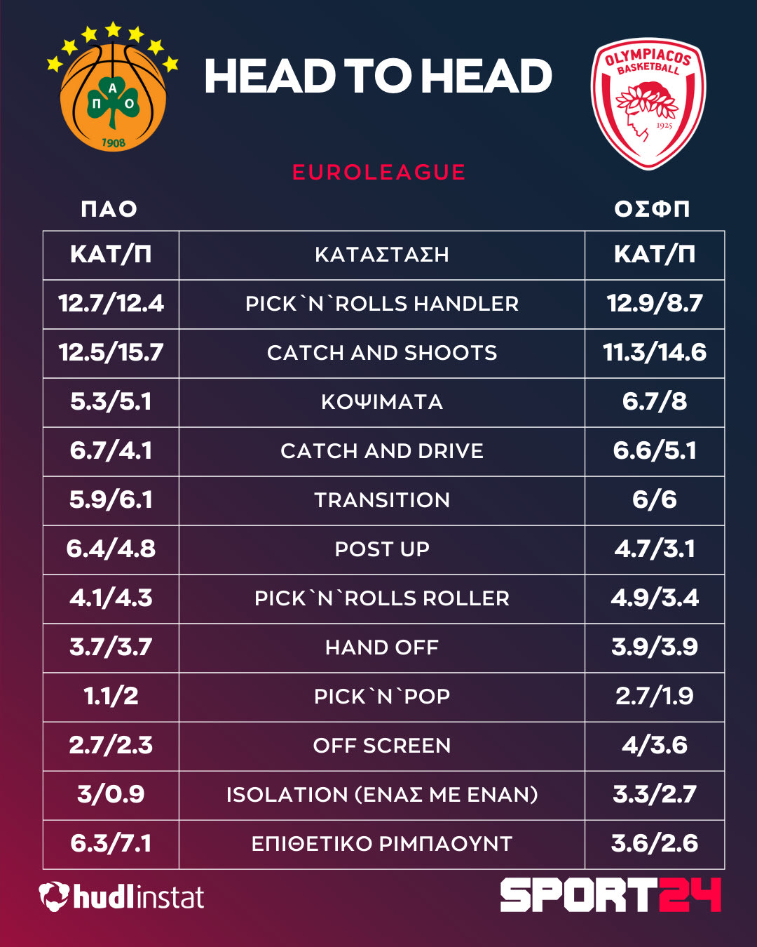 Είναι γνωστό ότι τον Παναθηναϊκό AKTOR οδηγεί η ποιότητα της τετράδας των Σλούκα, Ναν, Μπράουν, Γκραντ στην περιφέρεια. Η ικανότητα των τεσσάρων γκαρντ να δημιουργούν για τους συμπαίκτες τους και να εκτελούν αποτελεί την βασική αρχή της επίθεσης της ομάδας, με τους “πράσινους” να είναι – σύμφωνα με το Hudl Instat – η πιο παραγωγική ομάδα στο Pick and Roll όπου εκτελεί ο χειριστής της μπάλας, με 0.98 πόντους ανά κατοχή. Ο Ολυμπιακός από την πλευρά του έχει την τρίτη καλύτερη άμυνα στο Pick and Roll, δεχόμενος 0.6 πόντους ανά κατοχή.
