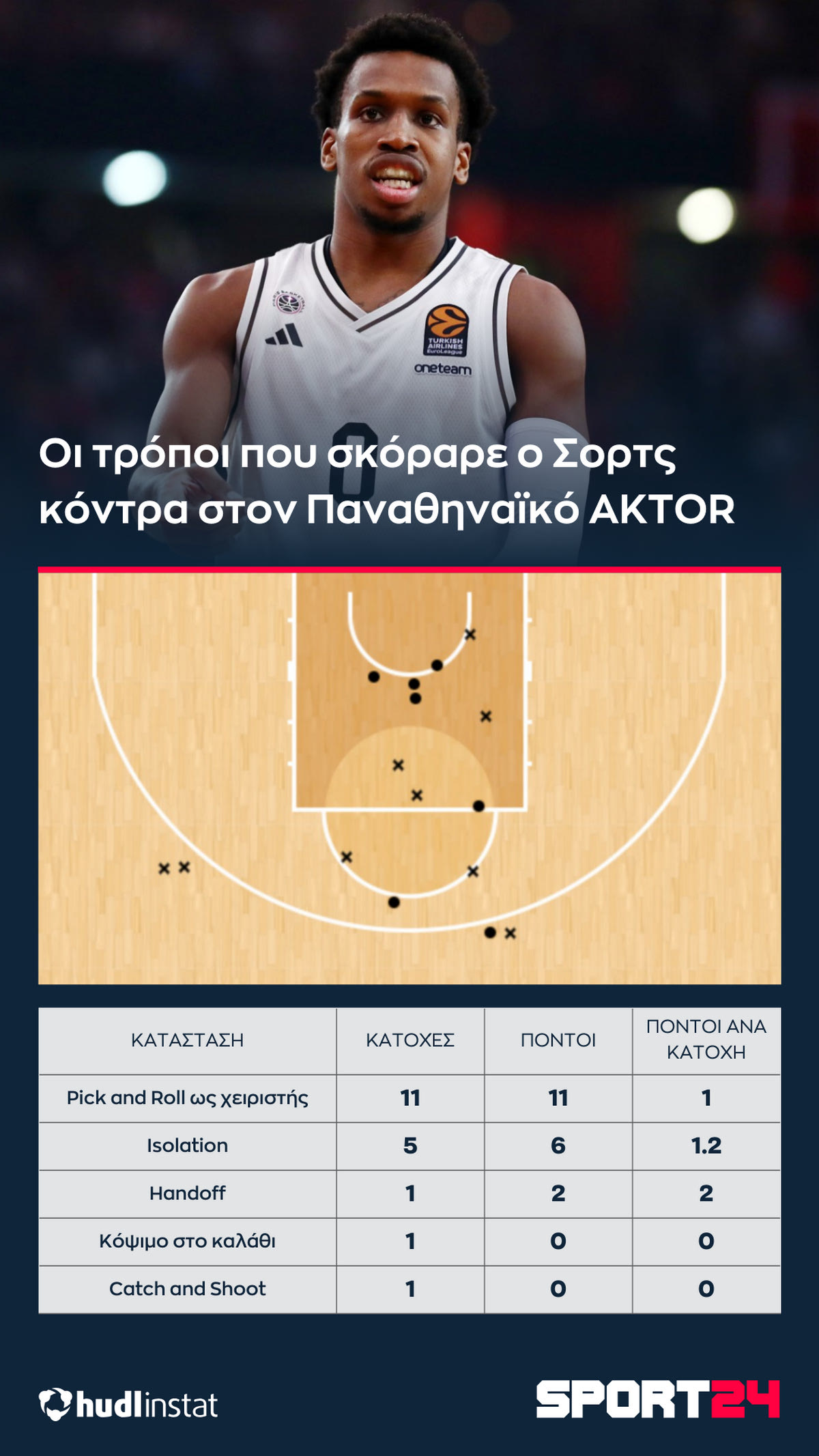 *Με κυκλάκι τα εύστοχα σουτ, με “x” τα άστοχαΟ Σορτς χτύπησε αλύπητα τον Παναθηναϊκό AKTOR στο Pick and Roll, τόσο ως εκτελεστής, όσο και ως δημιουργός, αφού διάβαζε τις βοήθειες του “τριφυλλιού”, πασάροντας πάντα γρήγορα και στον σωστό χρόνο στους συμπαίκτες του.