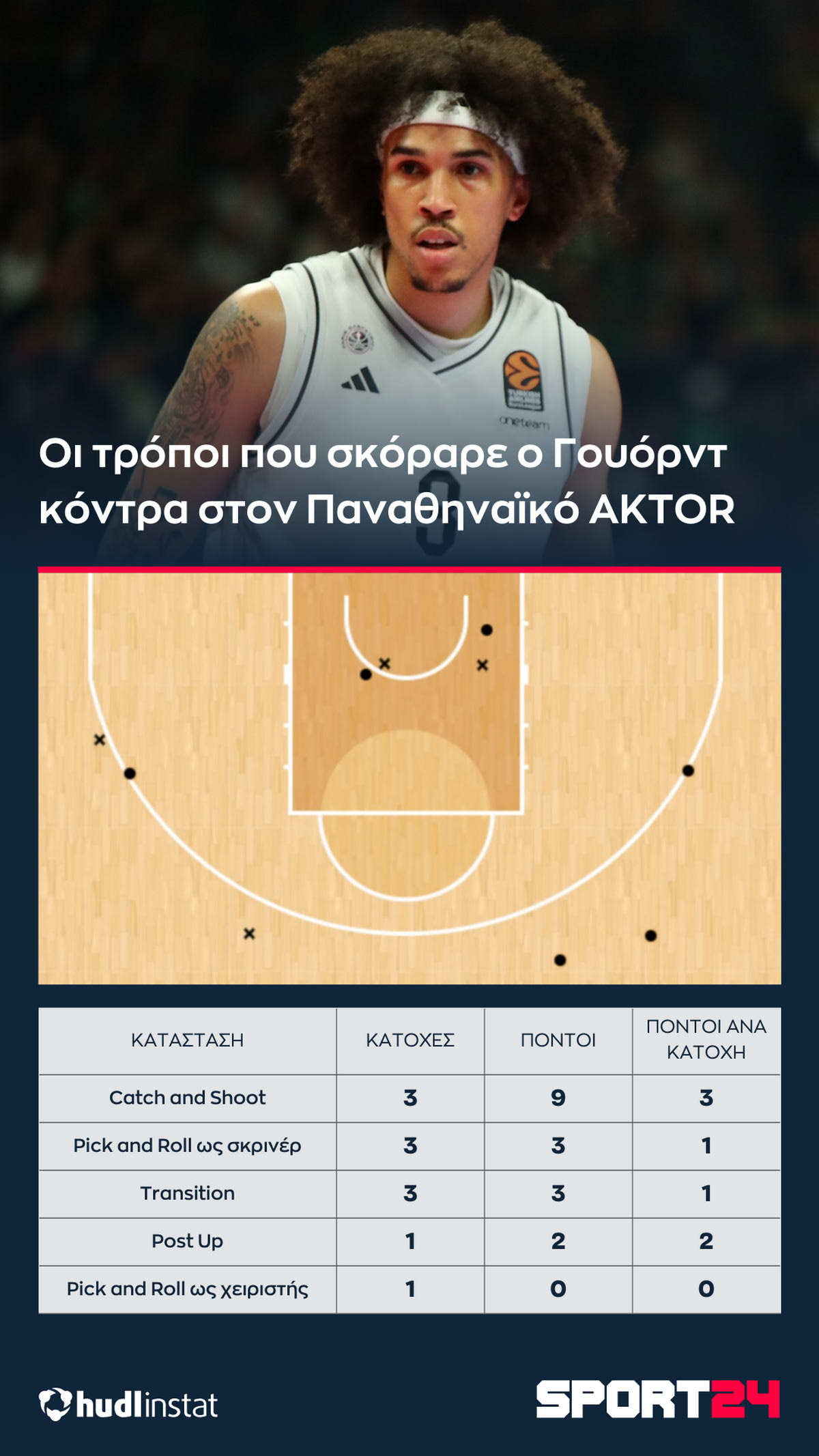*Με κυκλάκι τα εύστοχα σουτ, με “x” τα άστοχαΟ Αμερικανός φόργουορντ έβαλε μεγάλα σουτ στα δύο πρώτα δεκάλεπτα, εκμεταλλευόμενος τις πάσες του Σορτς, αλλά και την αδράνεια της πράσινης άμυνας. Ιδού ένα παράδειγμα: