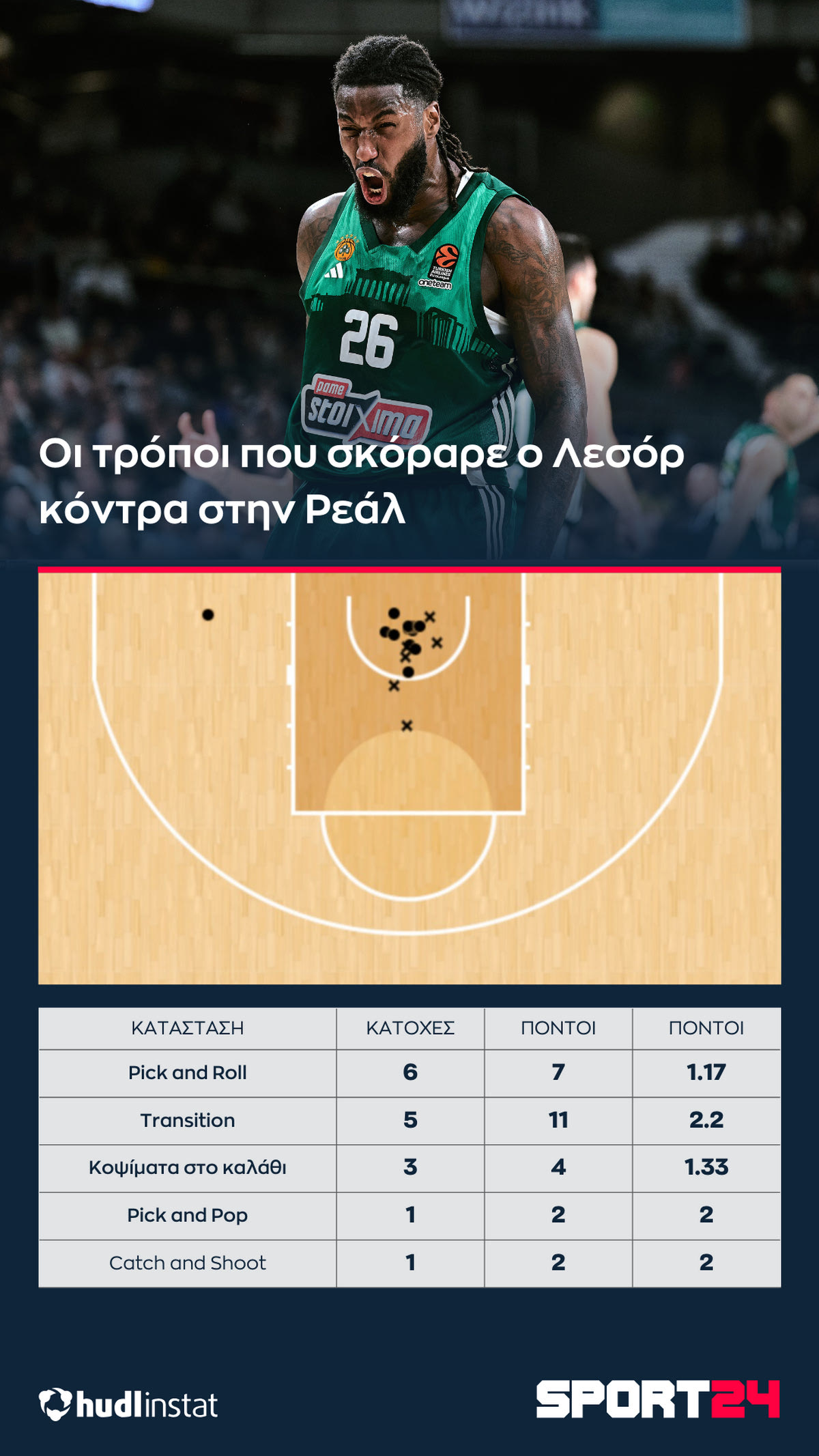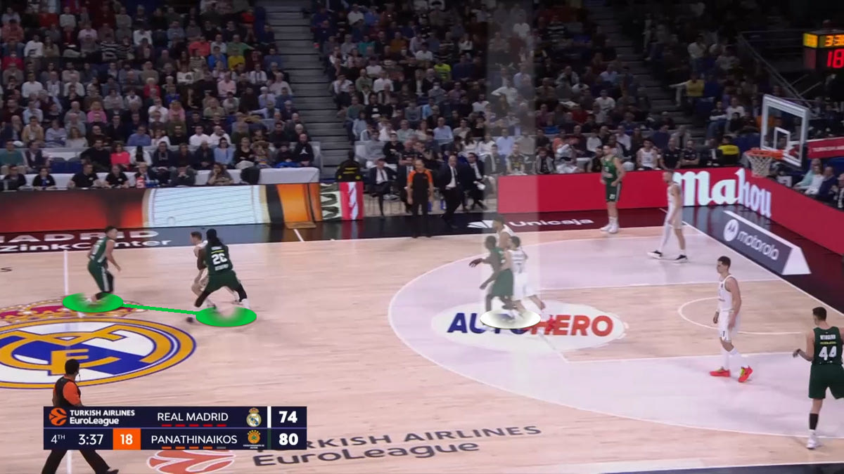 Σύμφωνα με το Hudl Instat, ο Παναθηναϊκός AKTOR σημείωσε 26 πόντους σε 16 κατοχές σε κατάσταση Pick and Roll (1.63 ανά κατοχή) που το σουτ πήρε ο χειριστής της μπάλας, σε ένα μυθικό νούμερο. Ο Σλούκας σημείωσε 11 από αυτούς (σε 6 κατοχές) και ο Ναν 10 (σε 5 κατοχές), τιμωρώντας συνεχώς την άμυνα των Μαδριλένων, σουτάροντας μετά από ντρίμπλα.