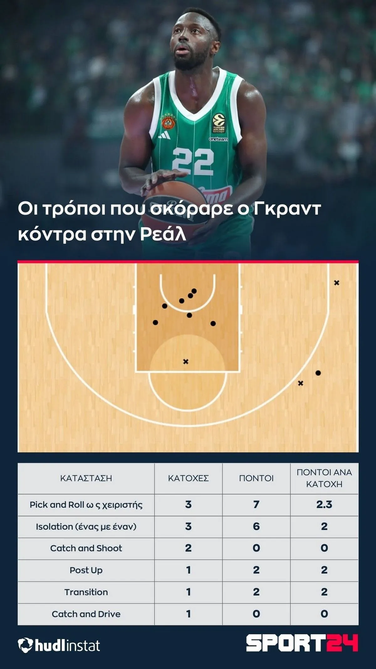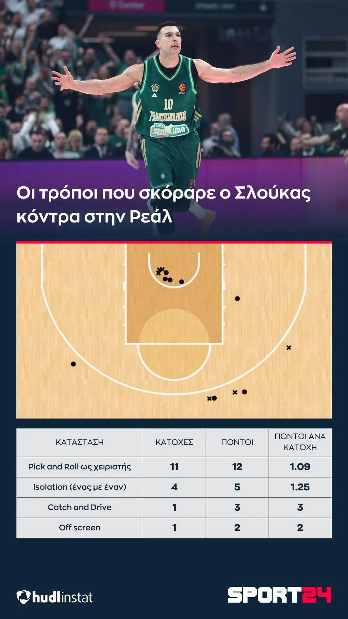 Ο Στέφανος Μακρής αναλύει με την βοήθεια του Hudl Instat την νίκη του Παναθηναϊκού AKTOR επί της Ρεάλ. Οι Σλούκας-Γκραντ που ήταν υπεύθυνοι για το 78% των πόντων του “τριφυλλιού”, οι λεπτομέρειες στο τέλος και το “ένα σουτ-ένα ματς”.
