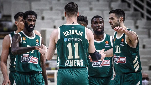 Οι παίκτες του Παναθηναϊκού πανηγυρίζουν τη νίκη επί της Αρμάνι Μιλάνο (1/4/2021)