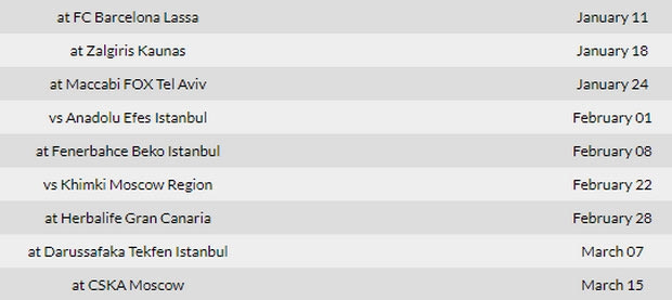 Η ομάδα του Ρικ Πιτίνο έχει μπροστά της τρία εκτός έδρας ματς, με τη Μπαρτσελόνα του Σβέτισλαβ Πέσιτς στις 11 Ιανουαρίου, με τη Ζάλγκιρις Κάουνας του Σαρούνας Γιασικεβίτσιους στις 18 Ιανουαρίου και με τη Μακάμπι Τελ Αβίβ του Γιάννη Σφαιρόπουλου στις 24 Ιανουαρίου.