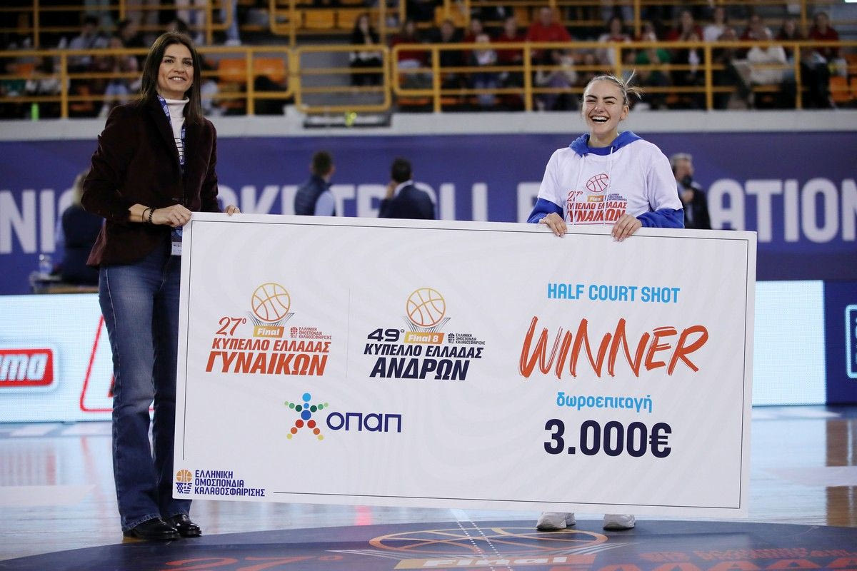 Μια νεαρή φίλαθλος κέρδισε 3.000 ευρώ στο ημίχρονο του τελικού του Κυπέλλου Γυναικών ΟΠΑΠ, ευστοχώντας σε απίθανο σουτ από το κέντρο του γηπέδου.