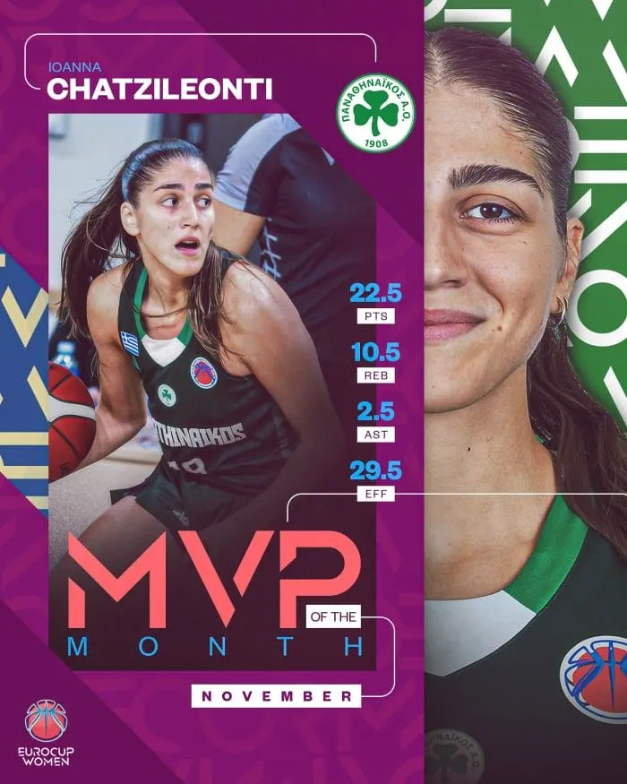 Η Ιωάννα Χατζιλεόντη αναδείχθηκε MVP του Νοεμβρίου σε αναγνώριση των εξαιρετικών επιδόσεών της που οδήγησαν τον Παναθηναϊκό στον 1ο γύρο των πλέι-οφ.