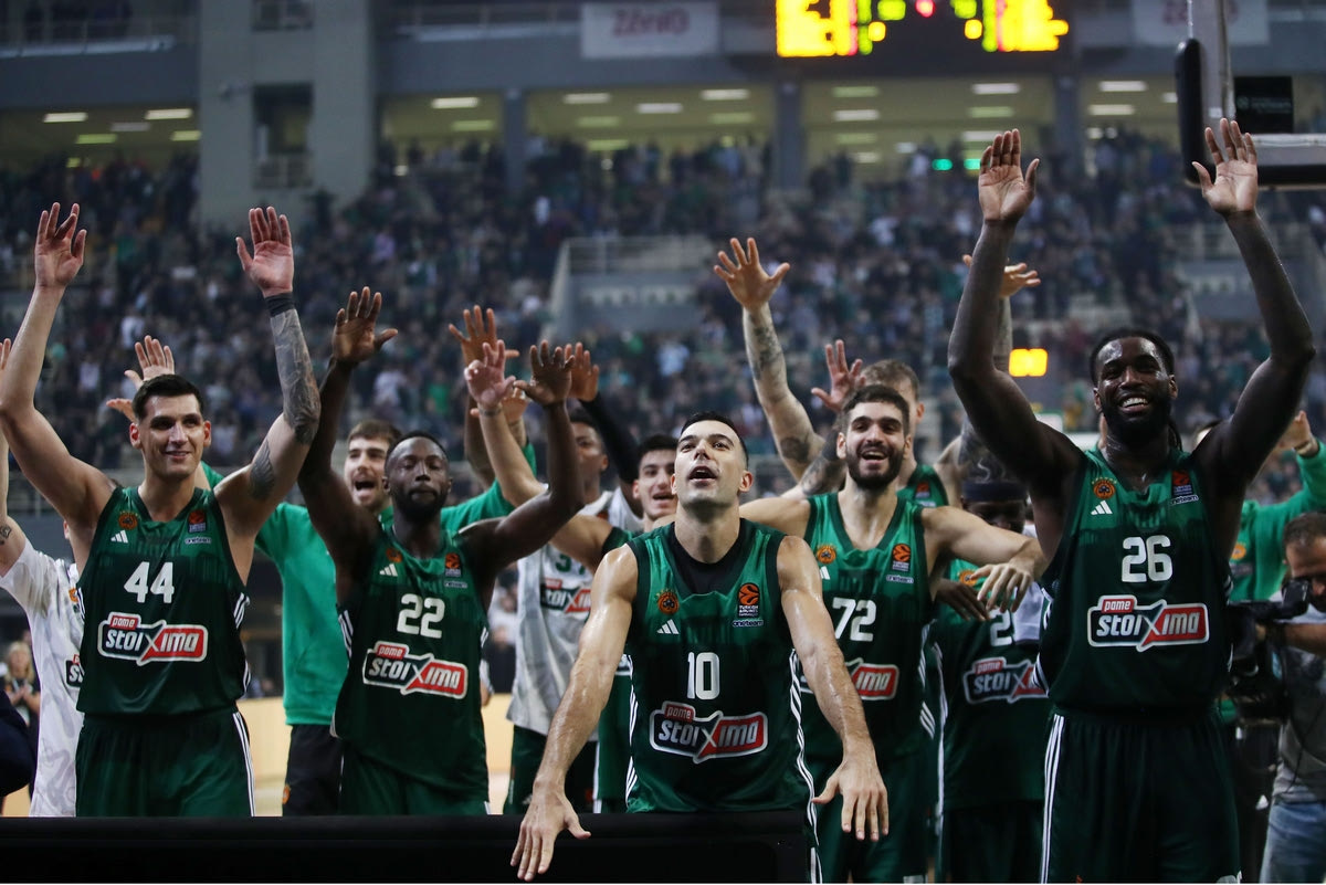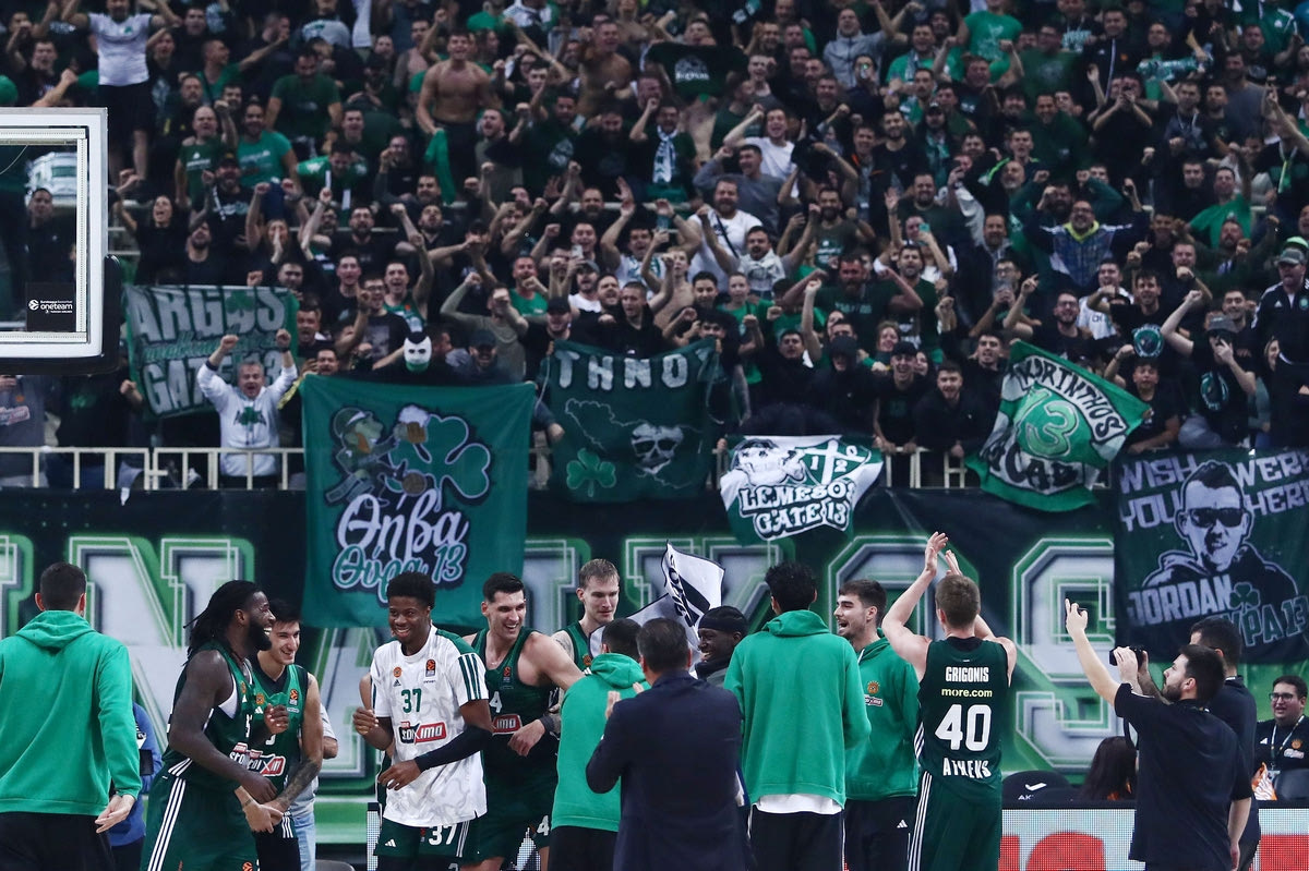 Με τον αρχηγό Σλούκα να δίνει το σύνθημα, οι παίκτες του Παναθηναϊκού γιόρτασαν μαζί με τον κόσμο τη νίκη επί της Βαλένθια ΒΟΛΙΤΑΚΗΣ ΣΤΕΛΙΟΣ / INTIME SPORTS