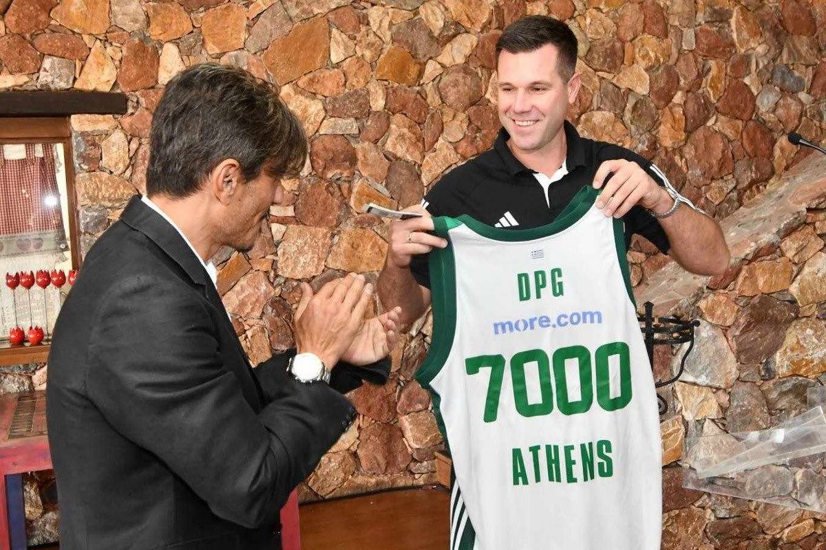 Από την πλευρά του, ο Σάνι Μπετσίροβιτς, εκ μέρους του αγωνιστικού τμήματος, προσέφερε μια φανέλα με το “7000” στον Δημήτρη Γιαννακόπουλο.