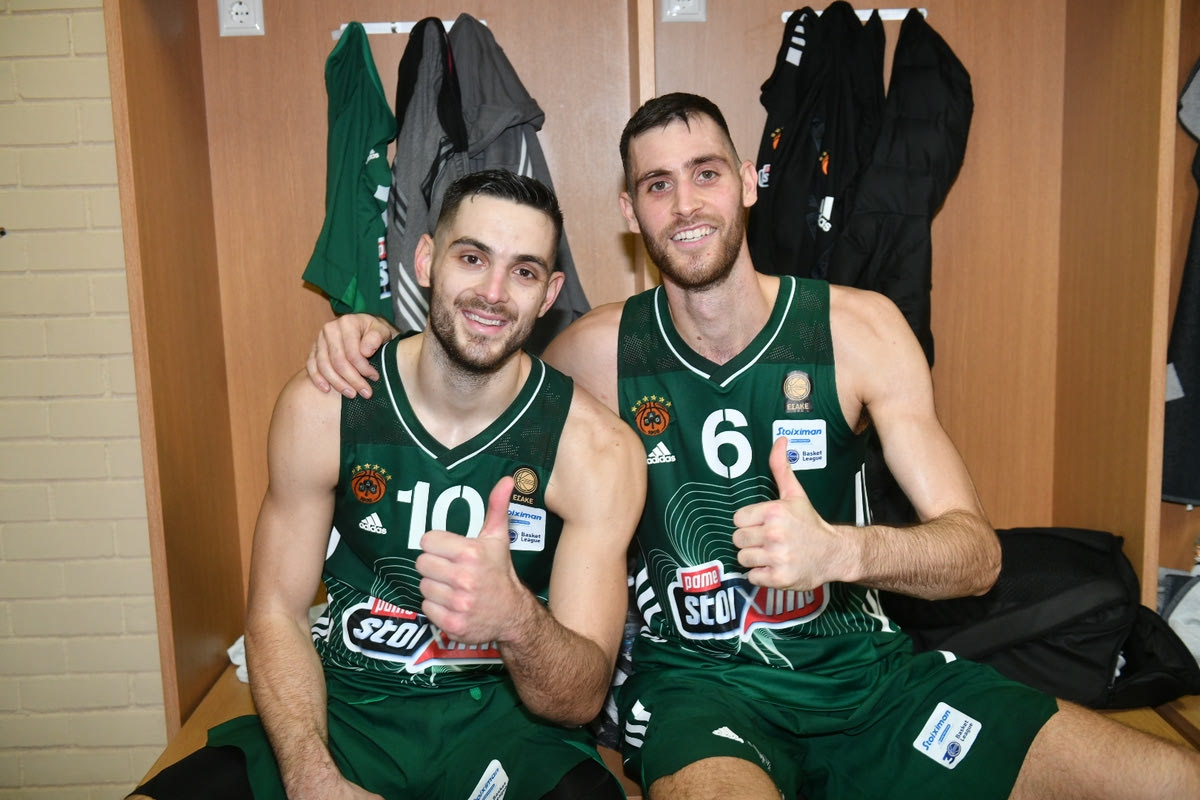 Ο Ιωάννης Παπαπέτρου και Γιώργος Παπαγιάννης πανηγυρίζουν τη νίκη του τριφυλλιού στα αποδυτήρια του ΣΕΦ V. Stolis