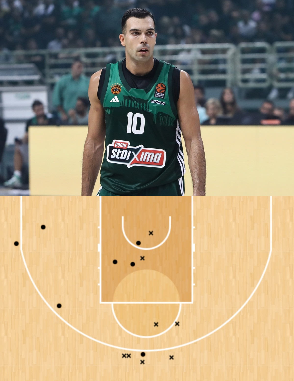 Ο Κώστας Σλούκας είναι ο άνθρωπος που έχει τα κλειδιά του Παναθηναϊκού. Αυτός από τον οποίο ξεκινούν όλα. Στο δεύτερο συναπάντημά του με τους “ερυθρόλευκους” είχε 20 πόντους με 7/15 σουτ (2/6 τρίποντα), 4/4 βολές), 3 ριμπάουντ, 3 ασίστ (από τις οποίες ο Παναθηναϊκός πήρε 9 πόντους) και 7 λάθη. Ιδού το Shot Chart του: