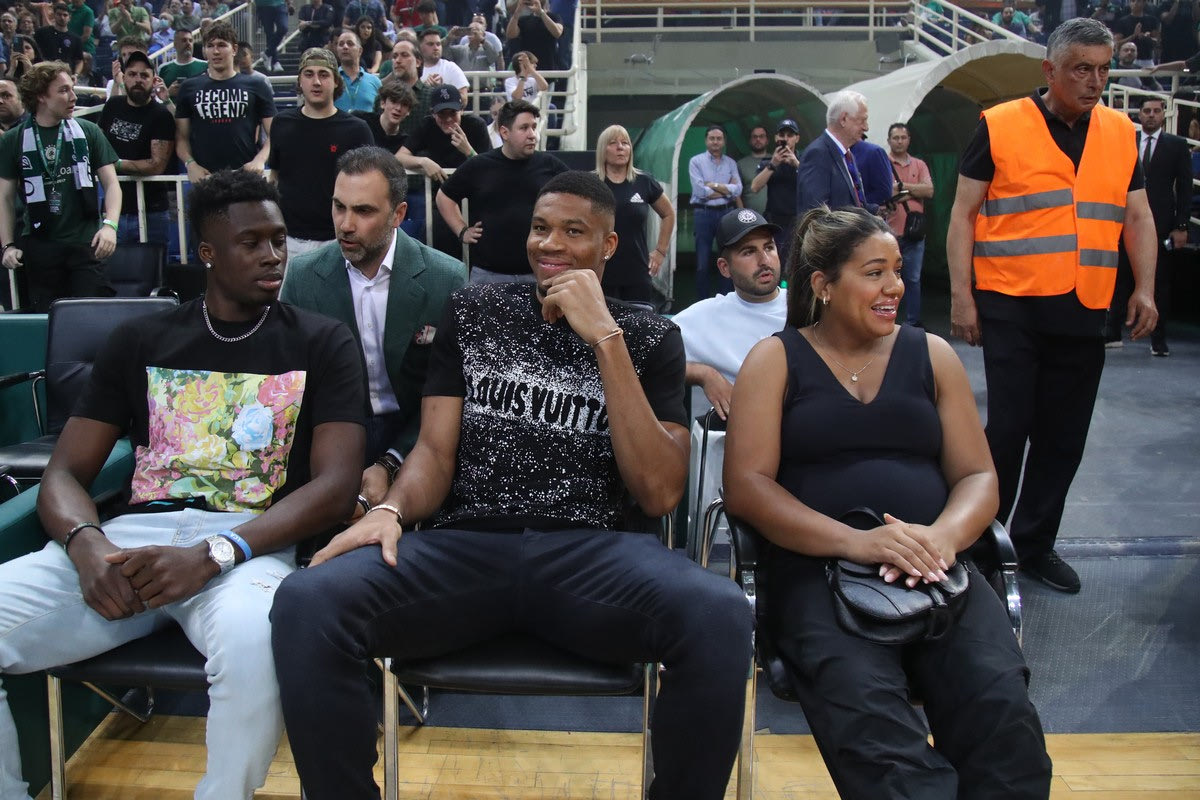 Ο Γιάννης Αντετοκούνμπο βρίσκεται στο ΟΑΚΑ για το Game 2 των τελικών μεταξύ Παναθηναϊκού και Ολυμπιακού στη Basket League. Μαζί του η σύντροφός του Μαράια Ριντλσπρίγκερ και ο αδερφός του Άλεξ Αντετοκούνμπο.