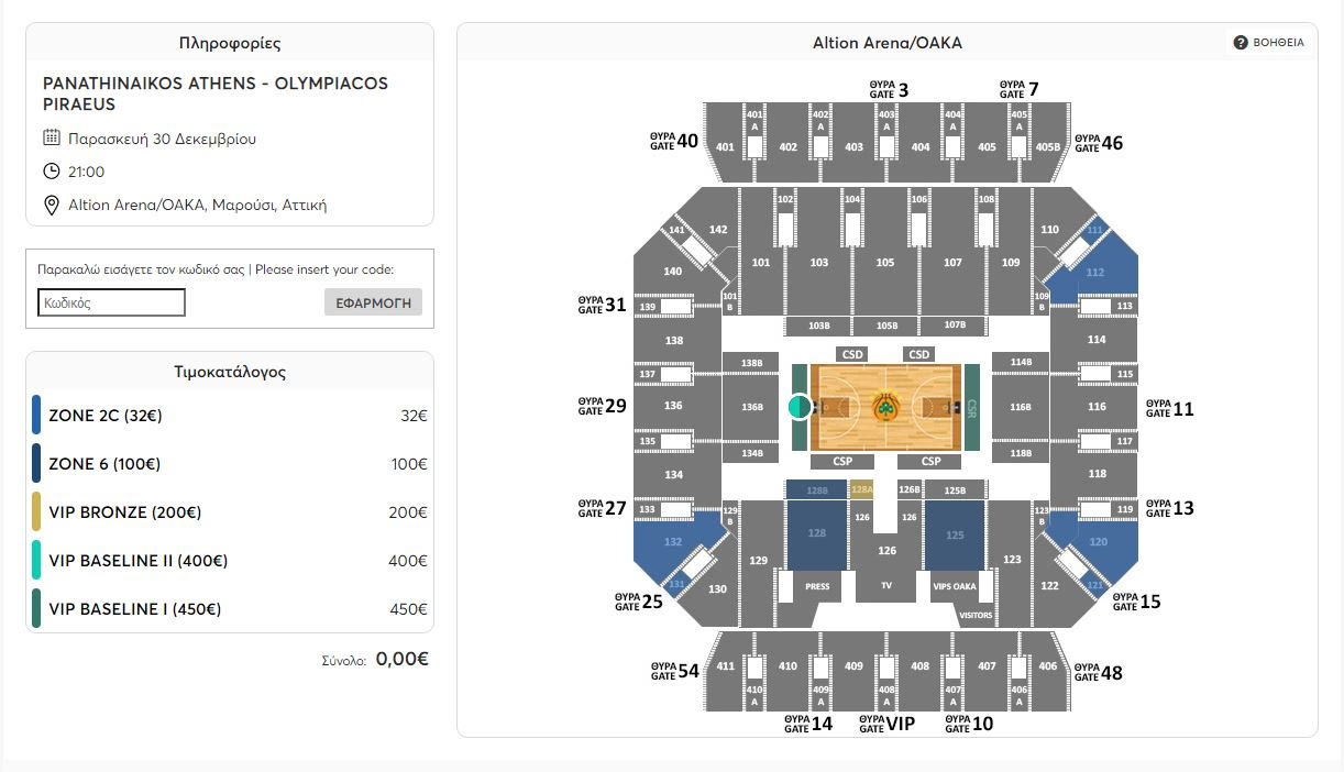 Όπως μπορεί να δει κανείς μπαίνοντας στην ηλεκτρονική πλατφόρμα με την οποία συνεργάζεται η ΚΑΕ Παναθηναϊκός για την πώληση των εισιτηρίων, μαγικά χαρτάκια έχουν απομείνει μόνο στα τρία πέταλα (πλην αυτού στο οποίο κάθονται οι οργανωμένοι), κάτω από τα δημοσιογραφικά και τα επίσημα, αλλά και στις VIP court side seats πίσω από τις δύο μπασκέτες.