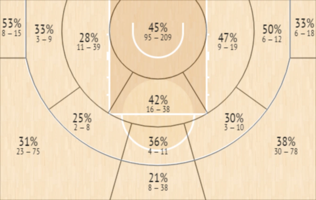 - Η Ζαλγκίρις σουτάρει τρίποντο με το όγδοο καλύτερο ποσοστό στη διοργάνωση (33.9%). Όπως προκύπτει από το ομαδικό Shot Chart του Instat Scout, οι ελάχιστα περισσότερες προσπάθειες εκδηλώνονται από το δεξί φτερό (36/96) με το ποσοστό σ’ αυτές τις περιπτώσεις ν’ αγγίζει το 38%! Από τ’ αριστερά πέφτει μεν στο 34.4% (με… 53% από τη γωνία), αλλά επί της ουσίας το συνολικό γκρεμίζεται επειδή οι πρωταθλητές Λιθουανίας έχουν βρει σίδερο στις 30 από τις 38 προσπάθειες που εκτελέστηκαν από το ύψος της κορυφής.