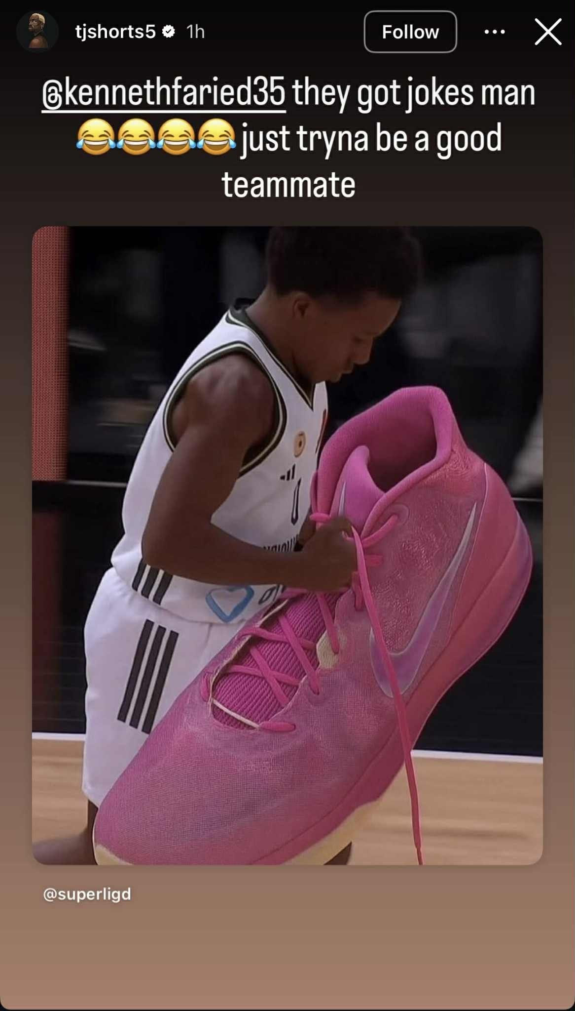 Ο Τι Τζέι Σορτς δημοσίευσε ένα επικό story στο Instagram με τη viral στιγμή που τρέχει για να δώσει στον Κένεθ Φαρίντ το χαμένο του παπούτσι στο ματς με την Παρί.