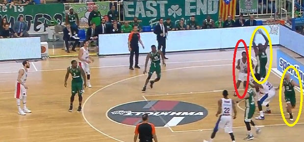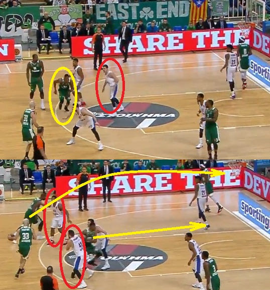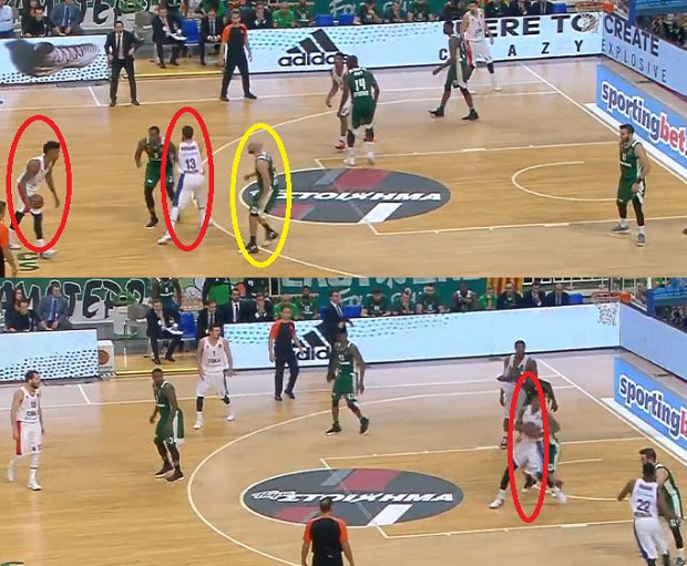 Ο Θανάσης δίνει το σκριν στην κορυφή, ο Κουρμπάνοφ βρίσκεται ήδη αρκετά μακριά ώστε να περιορίσει έστω και υποτυπωδώς το οπτικό πεδίο του Καλάθη, ενώ ο Ντε Κολό αντιμετωπίζει τη φάση πλήρως παθητικά –ο Θανάσης κινείται βαθιά στη ρακέτα και υποδέχεται εύκολα την μπάλα τελειώνοντας τη φάση με κάρφωμα.