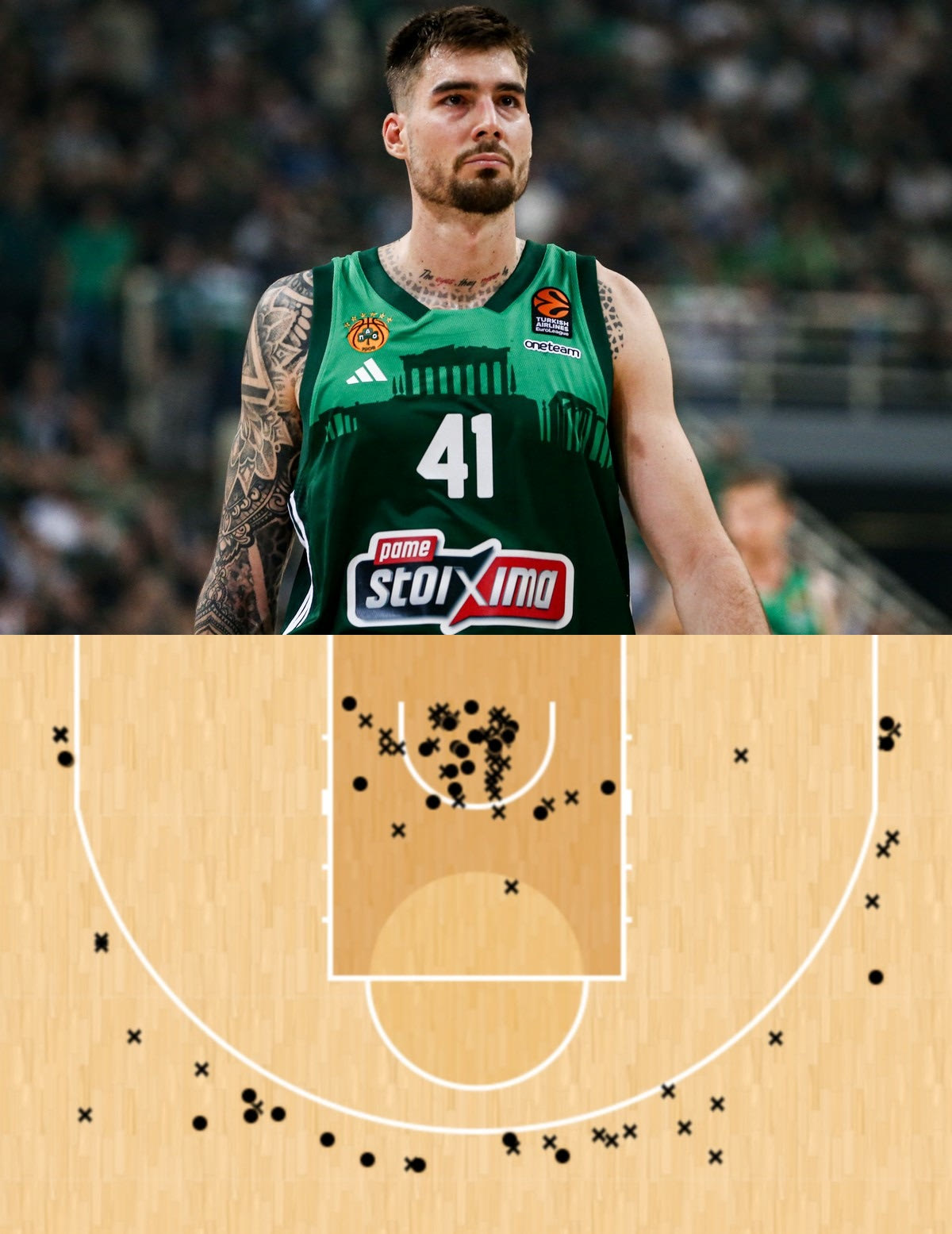 Ξεκινώντας από τα βασικά. Ο Ερνανγκόμεθ έχει φέτος σε όλες τις διοργανώσεις (EuroLeague, Stoiximan Basket League και Super Cup) 7.8 πόντους, 5.9 ριμπάουντ και 1 ασίστ μέσο όρο με 36.4% στα τρίποντα σε 23 λεπτά συμμετοχής. Ιδού και το Shot Chart του την φετινή σεζόν σε όλες τις διοργανώσεις: