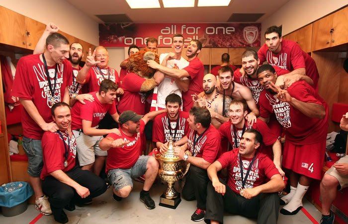 Οι πανηγυρισμοί είχαν αρχίσει στα αποδυτήρια των Πειραιωτών, με τους παίκτες να μπουγελώνονται και να βγάζουν φωτογραφίες με το τρόπαιο του πρωταθλήματος. Στο πλευρό των παικτών και ο κόουτς Ντούσαν Ίβκοβιτς, όσο και οι αδερφοί Αγγελόπουλοι.