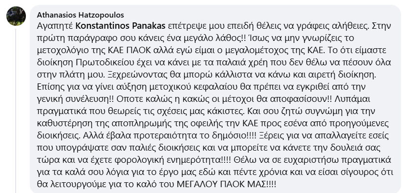 Το βράδυ της ίδιας ημέρας, ο Θανάσης Χατζόπουλος απάντησε σε ένα post πρώην στελέχους της ΚΑΕ ΠΑΟΚ στο Facebook, το οποίο ανέφερε ότι “δεν μπορεί να αρνηθεί την πρόταση, γιατί δεν είναι ιδιοκτήτης, αλλά διοίκηση πρωτοδικείου”. Σε αυτήν την τοποθέτηση, ο Θανάσης Χατζόπουλος τοποθετήθηκε για να ξεκαθαρίσει τα πράγματα, αναφέροντας ότι εκείνος είναι ο μεγαλομέτοχος της ΚΑΕ.