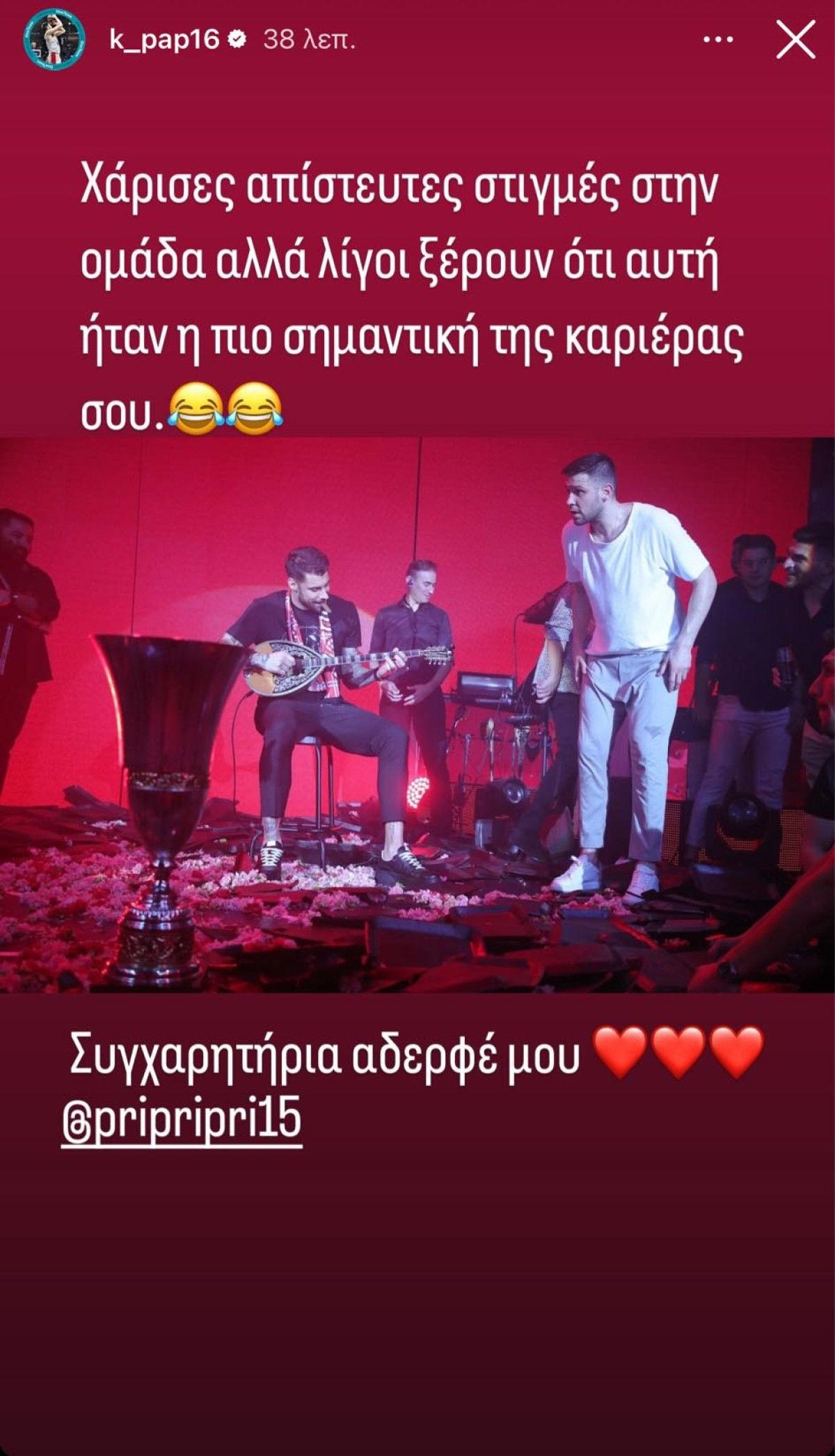 Το στιγμιότυπο είναι από τους πανηγυρισμούς για το πρωτάθλημα του 2022, με τον Πρίντεζη να πιάνει το μπουζούκι και τον Παπανικολάου να χορεύει.
