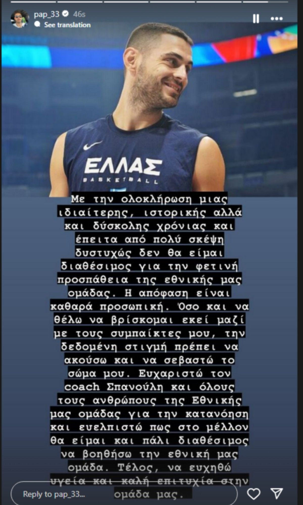 Ευχαριστώ τον coach Σπανούλη και όλους τους ανθρώπους της Εθνικής μας ομάδας για την κατανόηση και ευελπιστώ πως στο μέλλον θα είμαι και πάλι διαθέσιμος να βοηθήσω την Εθνική μας ομάδα. Τέλος, να ευχηθώ υγεία και καλή επιτυχία στην ομάδα μας”.