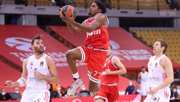 Ο Σακίλ ΜακΚίσικ σκοράρει με τη φανέλα του Ολυμπιακού κόντρα στην Ρεάλ Μαδρίτης σε αγώνα των δύο ομάδων στο ΣΕΦ για την Euroleague
