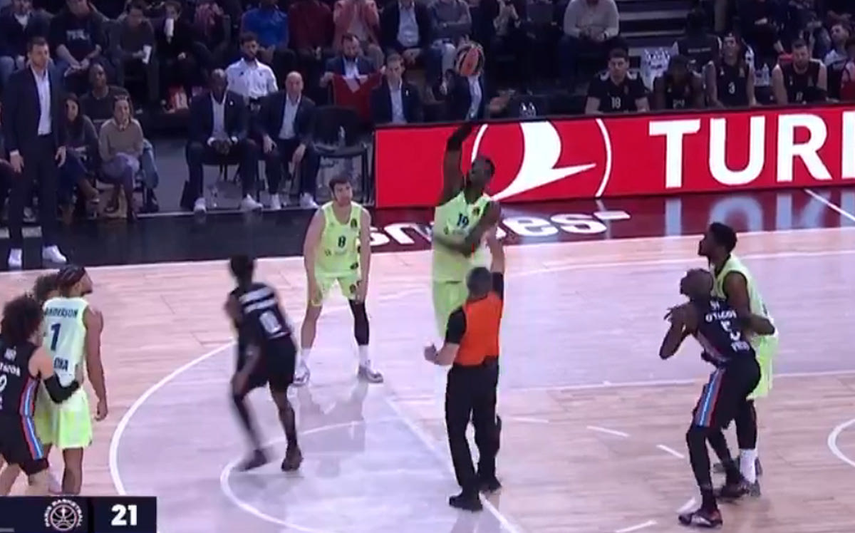 Ο Τι Τζέι Σορτς έφυγε μακριά από τον Γιουσοφά Φαλ σε ένα τζάμπολ στο παιχνίδι της Παρί με την Μπαρτσελόνα, με αποτέλεσμα ο τελευταίος να στείλει την μπάλα στην αγκαλιά του Μίκαελ Γιαντούνεν.
