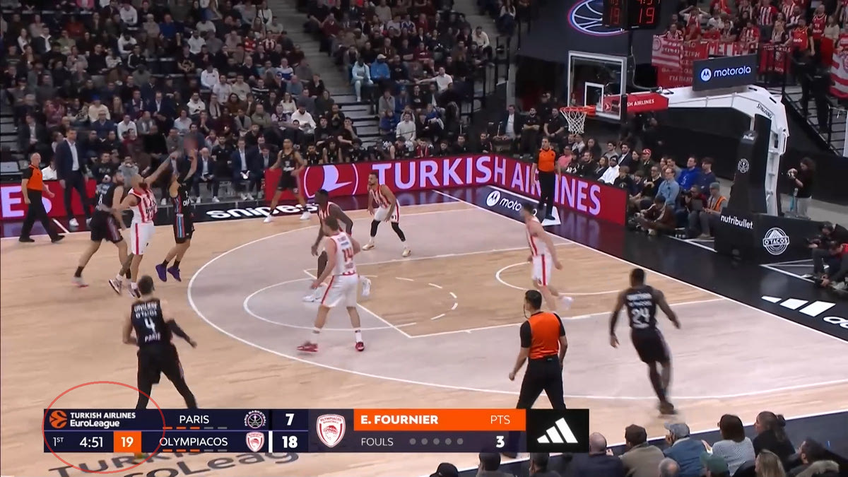Ο Φουρνιέ παίρνει τρίποντο με 8 δευτερόλεπτα για το τέλος της επίθεσης του Ολυμπιακού και 4:59 για το τέλος της πρώτης περιόδου, ευστοχώντας.