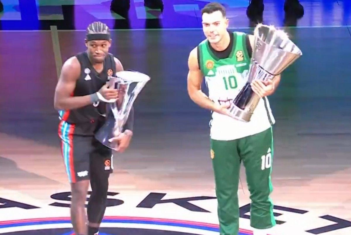 Πριν από το τζάμπολ στην αναμέτρηση της Παρί με τον Παναθηναϊκό AKTOR, οι Τι Τζέι Σορτς και Κώστας Σλούκας παρουσίασαν τα ευρωπαϊκά τρόπαια που κατέκτησαν την περυσινή σεζόν.