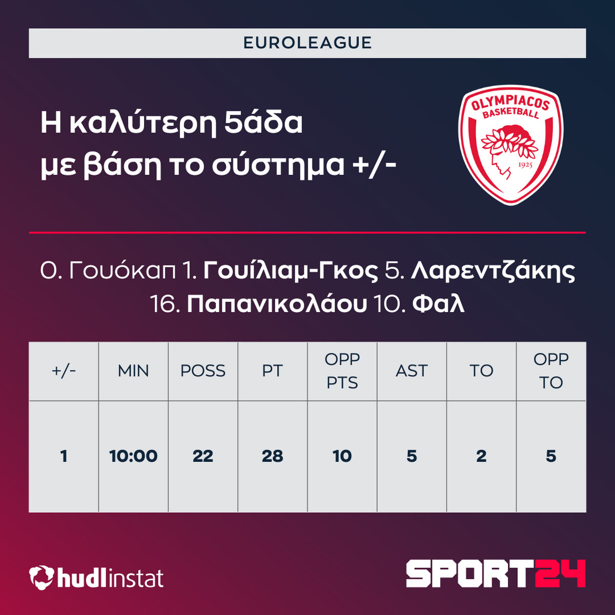 Είναι σαφές ότι η πεντάδα με την οποία παρέταξε ο Έλληνας τεχνικός τον Ολυμπιακό είχε ισορροπία, αφού είχε δύο χειριστές (Γουίλιαμς-Γκος και Γουόκαπ), καλές αποστάσεις λόγων των Λαρεντζάκη και Παπανικολάου και μέγεθος λόγω του Φαλ. Ήταν μία σκληρή πεντάδα. Υπάρχει όμως ακόμα μία λεπτομέρεια: Σύμφωνα με το Hudl Instat, η συγκεκριμένη πεντάδα έχει πατήσει παρκέ σε αγώνα της διοργάνωσης μόνο σε ένα ακόμα ματς: Αυτό κόντρα στην Παρτίζαν στον πρώτο γύρο, όταν ο Ολυμπιακός νίκησε με 98-94 στην παράταση!