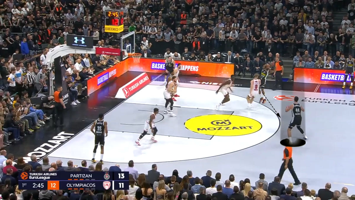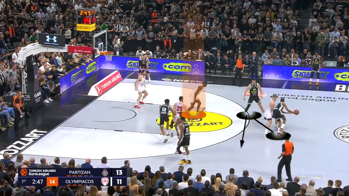 Ο Ολυμπιακός τότε επέλεξε να αφήσει λίγο πιο πίσω τον Φαλ (παίζοντας Flat), για να κόψει το drive στον Πάντερ. Η Παρτίζαν απάντησε με το να βάζει τον Καμίνσκι να κάνει Pop Out (να βγαίνει στην περιφέρεια) και να σουτάρει. Ιδού ένα παράδειγμα: