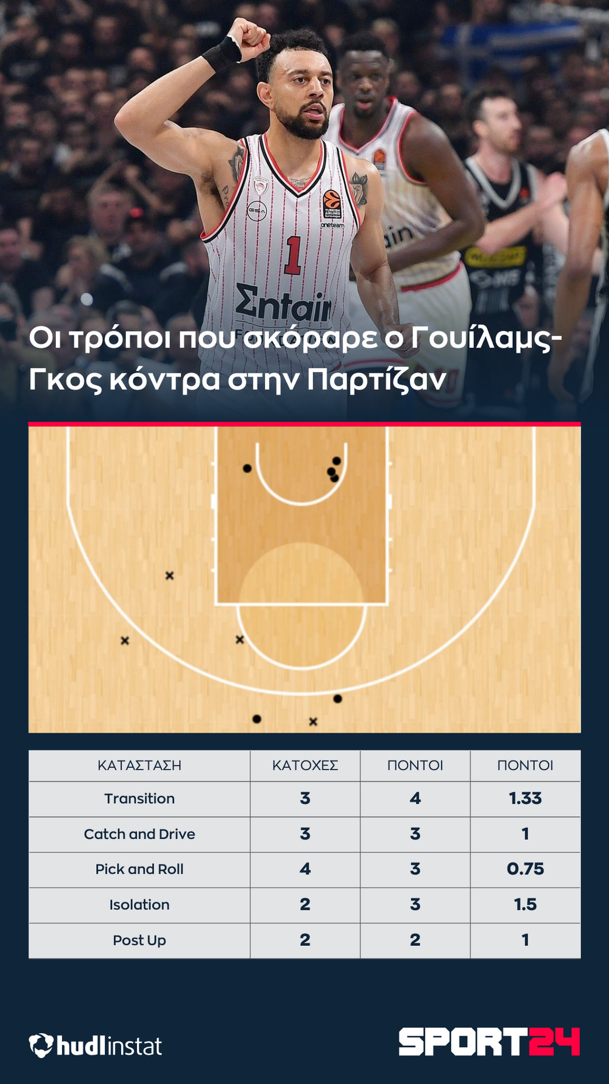 Ο Στέφανος Μακρής αναλύει με την βοήθεια του Hudl Instat την νίκη του Ολυμπιακού επί της Παρτίζαν. Το +18 της 5αδας της 4ης περιόδου που όλη την σεζόν έχει βρεθεί στο παρκέ στην EuroLeague μόνο στα ματς με την Παρτίζαν και ο διπλός ρόλος του Γουίλιαμς-Γκος, ο οποίος πέρα από την επίθεση είχε ένα μυθικό νούμερο στην άμυνα.