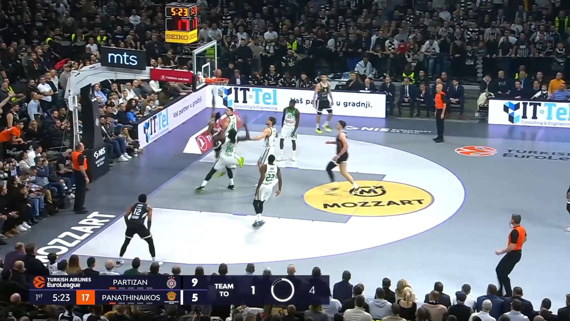 Η Παρτίζαν εκδήλωσε συνολικά 32 επιθέσεις στο πρώτο μέρος (σε δύο εξ αυτών κέρδισε βολές). Στις 15 από αυτές (παρά μία τις μισές δηλαδή) πήρε σουτ στα πρώτα 10 δευτερόλεπτα της επίθεσης. Το πόσο στοχευμένο ήταν αυτό φαίνεται από ένα άλλο νούμερο: Στα προηγούμενα 13 παιχνίδια της στην EuroLeague, η Παρτίζαν εκδήλωνε κατά μέσο όρο 15 επιθέσεις ανά αγώνα στα πρώτα 10 δευτερόλεπτα. Κόντρα στους “πράσινους” είχε πιάσει αυτό το νούμερο στο ημίχρονο.