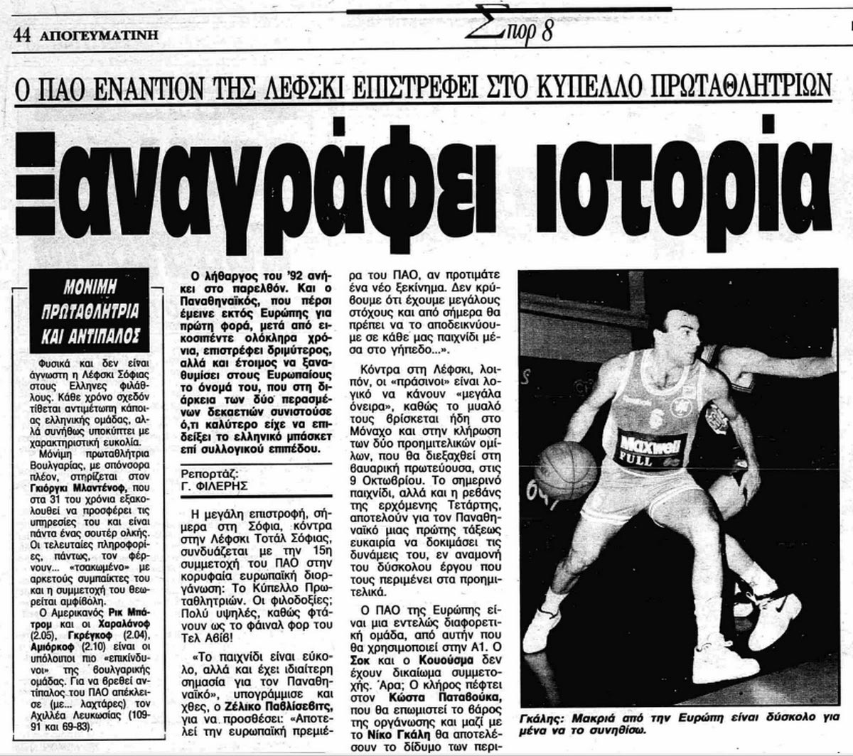 “Φέτος θα είμαι καλύτερος, γιατί έχω προσαρμοστεί πλήρως στα δεδομένα του Παναθηναϊκού. Με ρωτάτε συνέχεια για την ηλικία μου, σας πληροφορώ ότι νιώθω σε εξαιρετική κατάσταση. Έχω στερηθεί πάρα πολλά για να βρίσκομαι πάντα σε αυτό το επίπεδο“, σχολίαζε με νόημα ο Γκάλης, προαναγγέλλοντας μια εξαιρετική χρονιά. Ουσιαστικά την τελευταία του, αφού τέτοιες μέρες του 1994 ξαφνικά έβγαλε την μπρίζα…