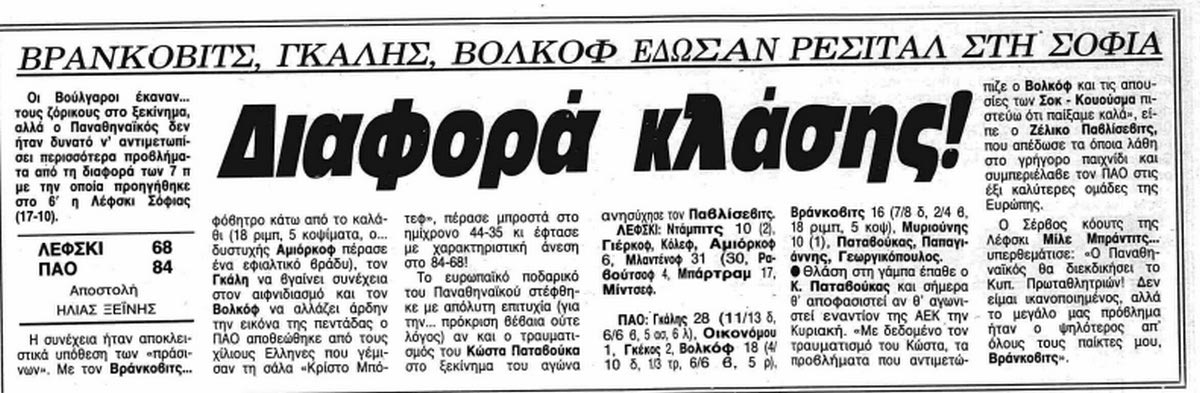 Παραμονές του πρώτου αγώνα στη Σόφια, ο Παναθηναϊκός έπαιζε στη Χαλκίδα (ήταν τιμωρημένος) με τον Απόλλωνα Πάτρας, για τη δεύτερη αγωνιστική της Α1. Νίκησε σχετικά εύκολα (79-67), με τους οπαδούς πάντως της ομάδας να αποθεώνουν τον… Ίβιτσα Όσιμ και να φωνάζουν, το ιστορικό σύνθημα “Παύλο Θεέ πάρε την ΠΑΕ”.
