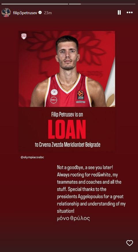 Με ένα όμορφο story στο Instagram, ο Φιλίπ Πετρούσεβ ευχαρίστησε τη διοίκηση του Ολυμπιακού για την κατανόηση και την απόφασή τους να τον παραχωρήσουν δανεικό στον Ερυθρό Αστέρα για το υπόλοιπο της σεζόν, ενώ δεν παρέλειψε να αναφερθεί και στα άλλα μέλη της ομάδας.