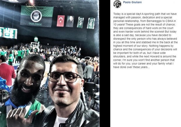” Η σημερινή είναι μια ιδιαίτερη μέρα! Ένας δρόμος που διαχειριστήκαμε με πάθος, αφοσίωση και μια σπέσιαλ προσωπική σχέση, οδήγησε από το Μπερναρέτζιο στην ΤΣΣΚΑ μέσα σε δέκα 10 χρόνια. Αυτοί οι στόχοι δεν είναι αποτελέσματα μιας ευκαιρίας, αλλά συνέπειες σκληρής δουλειάς στο παρκέ και ακόμα πιο σκληρής στα παρασκήνια. Όμως η σημερινή είναι ταυτόχρονα και μια στενάχωρη μέρα, επειδή αποφάσισες να δείξεις ασέβεια στον μοναδικό άνθρωπο που πάντα πίστευε σε εσένα όλα αυτά τα χρόνια. Με μαχαίρωσες πισώπλατα στη σημαντικότερη στιγμή της ιστορίας μας. Οι συνέπειες των αποφάσεών σου θα είναι σημαντικές και για τους δυο μας. Έχω μεγάλους ώμους και ενώ ο επόμενος Χάουαρντ Σαντ-Ρος βρίσκεται κάπου εδώ γύρω, είμαι σίγουρος ότι δεν θα βρεις άλλον άνθρωπο που θα κάνει για εσένα, την καριέρα και την οικογένειά σου όσα έκανα όλα αυτά τα χρόνια” αναφέρει στη δημοσίευσή του ο Τζουλιάνι