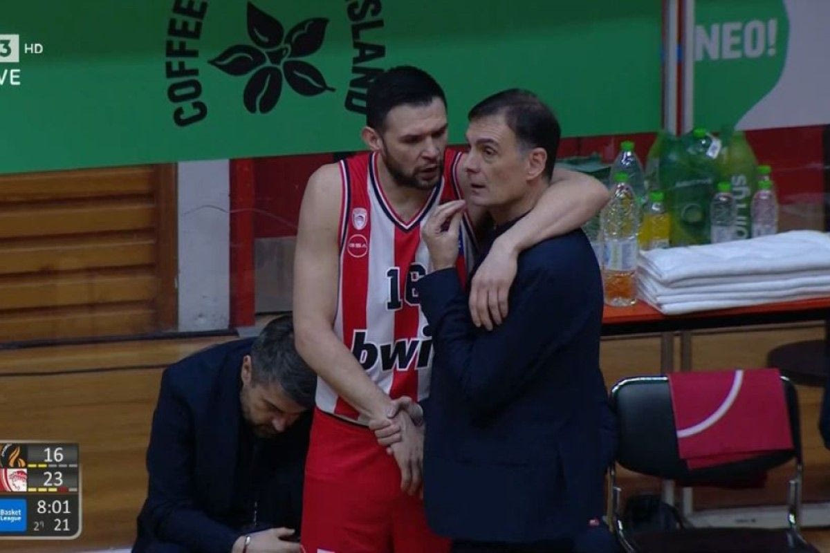 Κώστας Παπανικολάου και Γιώργος Μπαρτζώκας αγκαλιάστηκαν και έκαναν μία μίνι "σύσκεψη", όταν ο αρχηγός του Ολυμπιακού πέρασε στον πάγκο, έχοντας κάνει δύο προσωπικά φάουλ σε 12 λεπτά αγώνα κόντρα στον Προμηθέα.