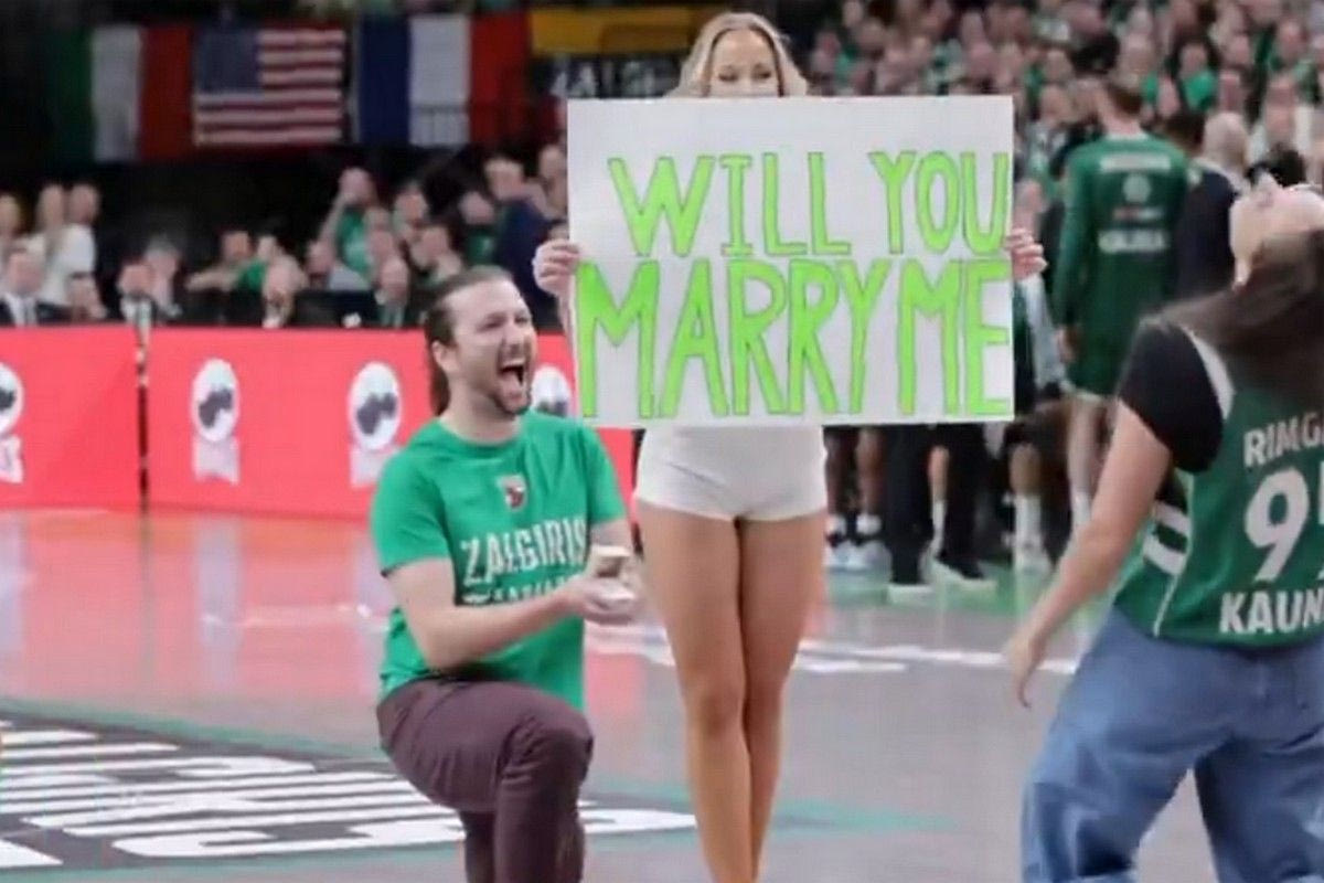 Μια ανεπανάληπτη στιγμή εκτυλίχθηκε στο ημίχρονο του αγώνα μεταξύ Ζάλγκιρις και Ολυμπιακού, όταν ένας οπαδός της λιθουανικής ομάδας έκανε πρόταση γάμου στη σύντροφό του μέσα στο παρκέ. Με τα μάτια της δεμένα και την αγάπη της ζωής της να γονατίζει μπροστά της, η απάντηση της κοπέλας συγκίνησε το κοινό, μετατρέποντας τον αγώνα σε μια αξέχαστη βραδιά.
