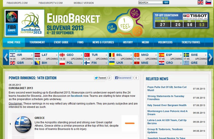 Ελπιδοφόρο αν μη τι άλλο… Σύμφωνα με την επίσημη ιστοσελίδα της FIBA Europe και τα rankings, η Ελλάδα είναι το πρώτο φαβορί για να βρεθεί στο πρώτο σκαλί του βάθρου στο Ευρωμπάσκετ του Σεπτεμβρίου (4-22/9).