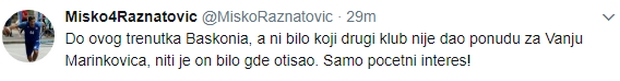 Την ίδια στιγμή που ο προπονητής της Παρτιζάν παραδέχθηκε με δηλώσεις του ότι ο Βάνια Μαρίνκοβιτς θα παραχωρηθεί στη Μπασκόνια, ο μάνατζερ του παίκτη, Μίσκο Ραζνάντοβιτς, διέψευσε το γεγονός, υποστηρίζοντας ότι δεν έχει κατατεθεί πρόταση για τον διεθνή γκαρντ.