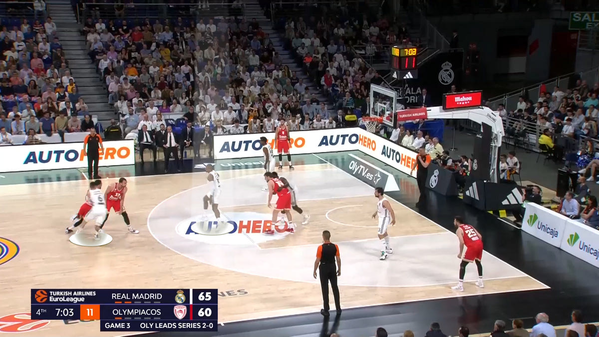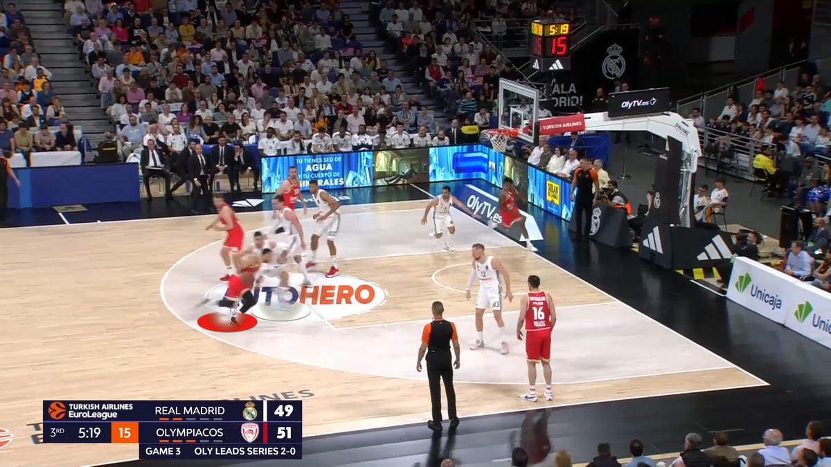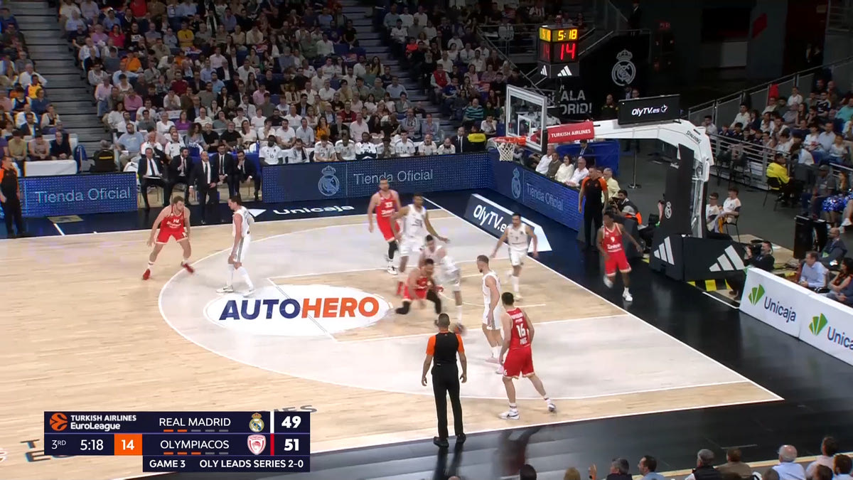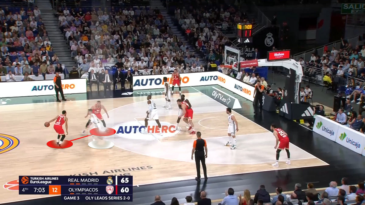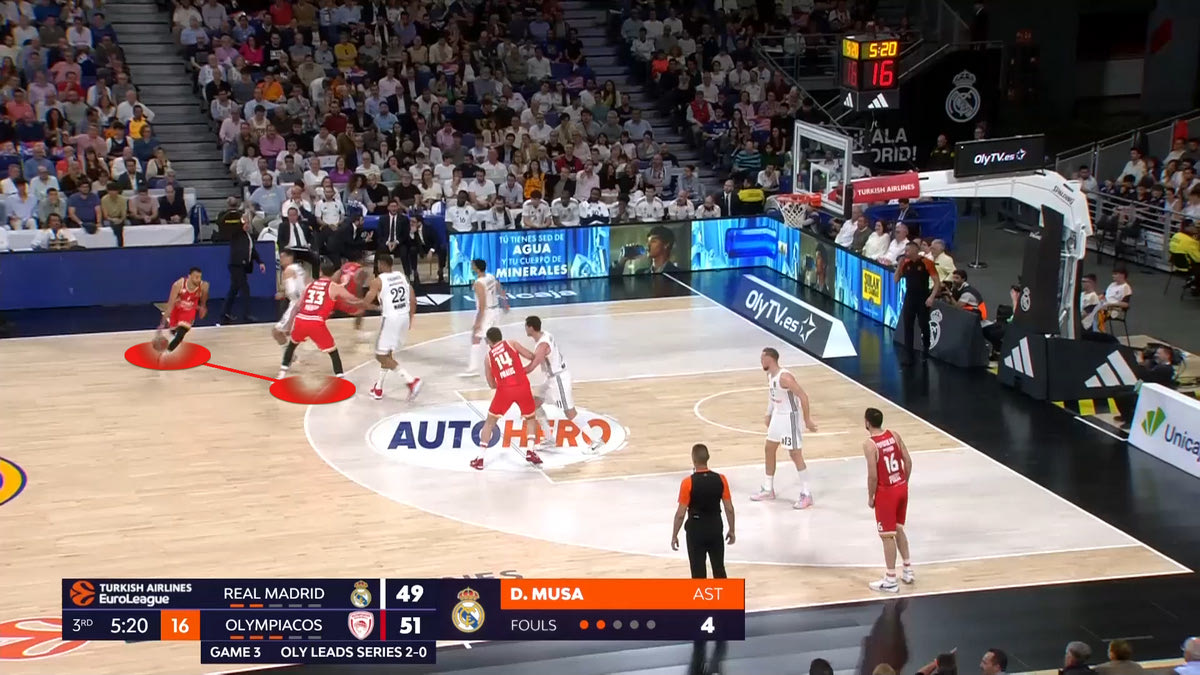 Ο Ολυμπιακός είχε για ακόμα ένα παιχνίδι πρόβλημα με την άμυνα της Ρεάλ. Το γεγονός ότι οι Μαδριλένοι αλλάζουν σε όλες τις φάσεις (σκριν, Pick and Roll, handoff) στις θέσεις 1-4, σε συνδυασμό με την παρουσία του Έντι Ταβάρες στο παρκέ έχει δυσκολέψει τον Ολυμπιακό από το Game 2 και μετά. Αυτό φάνηκε και στο Game 3, όπου από ένα σημείο κι έπειτα έμεινε ο Σάσα Βεζένκοβ να παλεύει μόνος του στην επίθεση.