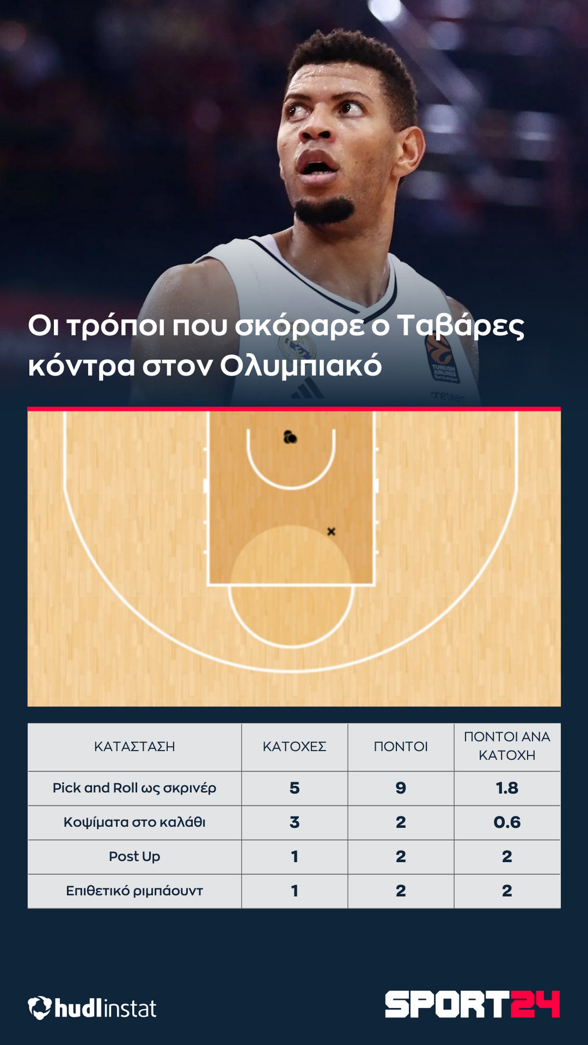 *Με κυκλάκι τα εύστοχα σουτ, με “x” τα άστοχαΚι αν ο Ταβάρες ήταν κομβικός, εξίσου σημαντικό για την Ρεάλ ήταν ότι ήταν ανταγωνιστική όταν καθόταν στον πάγκο, ειδικά στο δεύτερο μέρος. Ήταν τότε που οι Μαδριλένοι άντεξαν για σχεδόν 8 λεπτά (7:40 για την ακρίβεια) από το φινάλε της 3ης περιόδου μέχρι τα μέσα της της 4ης περιόδου με το δίδυμο των Γκαρούμπα-Ιμπάκα κάτω από το καλάθι. Το ακόμα πιο παράδοξο; Την ίδια στιγμή βρίσκονταν ακόμα στον πάγκο όλοι οι σταρ της ομάδας, αφού έπαιρναν ταυτόχρονα ανάσες οι Καμπάσο, Μούσα, Χεζόνια και Ταβάρες. Σε αυτά τα 7:40 το επιμέρους σκορ ήταν 16-12 για την Ρεάλ και αποδείχθηκε καθοριστικό στο φινάλε, αφού οι βασικοί τους παίκτες ήταν ξεκούραστοι στο φινάλε.