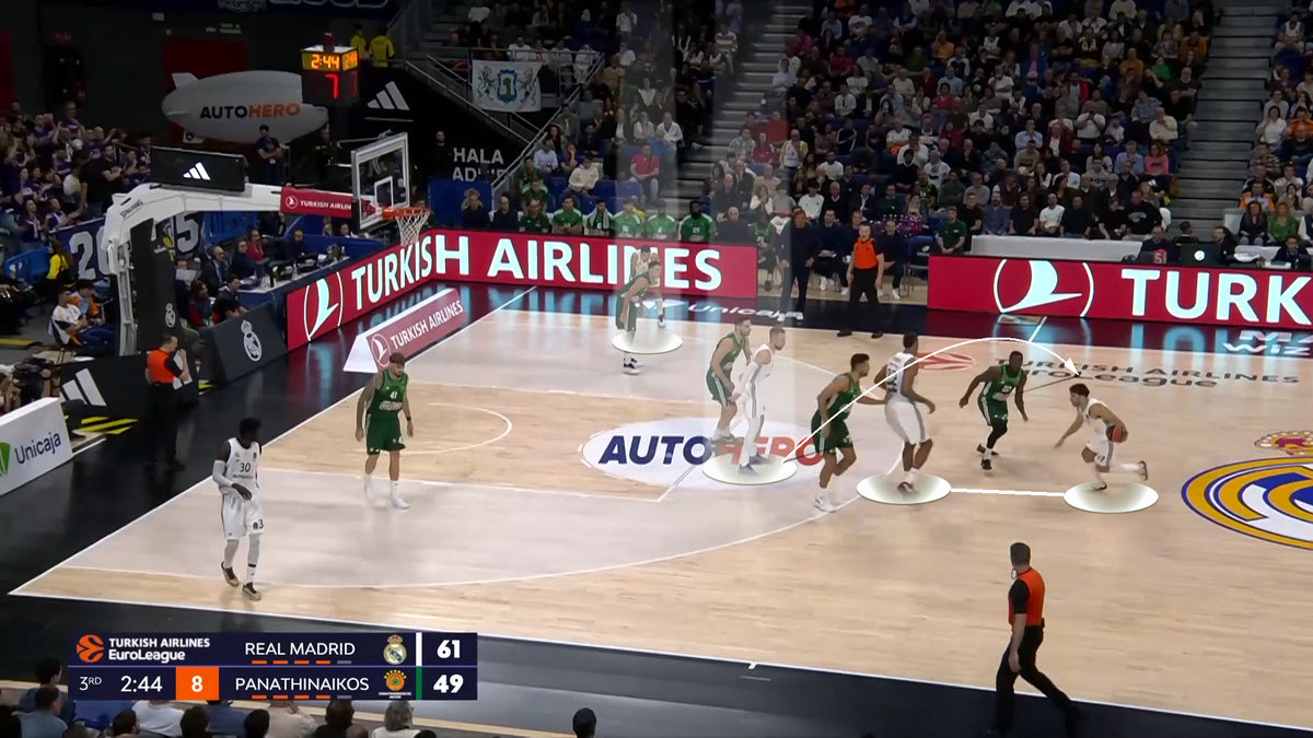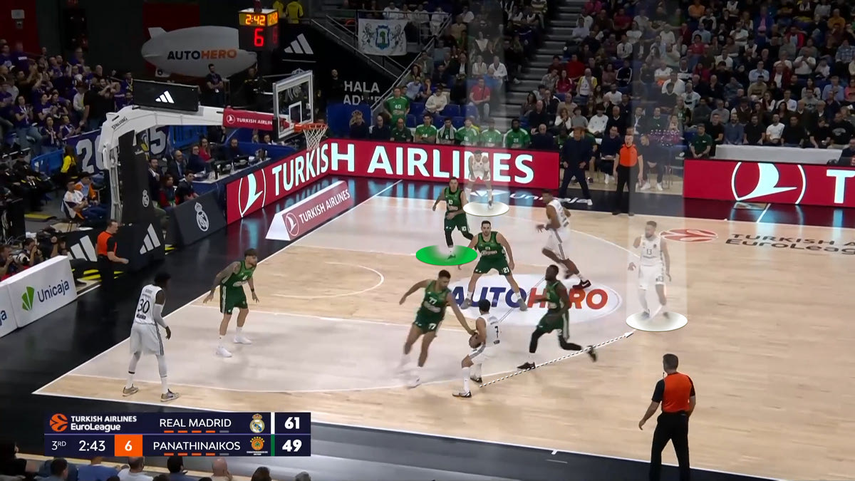 Μία ομάδα μπορεί να αντέξει να δεχθεί πολλούς πόντους στο Pick and Roll ή στο Catch and Shoot, γιατί σημαίνει συνήθως ότι έχει κόψει το ένα από τα δύο στον αντίπαλό της. Όταν όμως δέχεται πολλούς πόντους και στις δύο καταστάσεις, αυτό σημαίνει ότι ο αντίπαλος ένιωσε άνετα. Σκόραρε όπως ήθελε. Η Ρεάλ βρήκε το ψεγάδι στην άμυνα του Παναθηναϊκού AKTOR στο Pick and Roll (την βοήθεια που δίνεται από την αδύνατη πλευρά στον παίκτη που ρολάρει) και βρήκε την πάσα στην απέναντι γωνία.